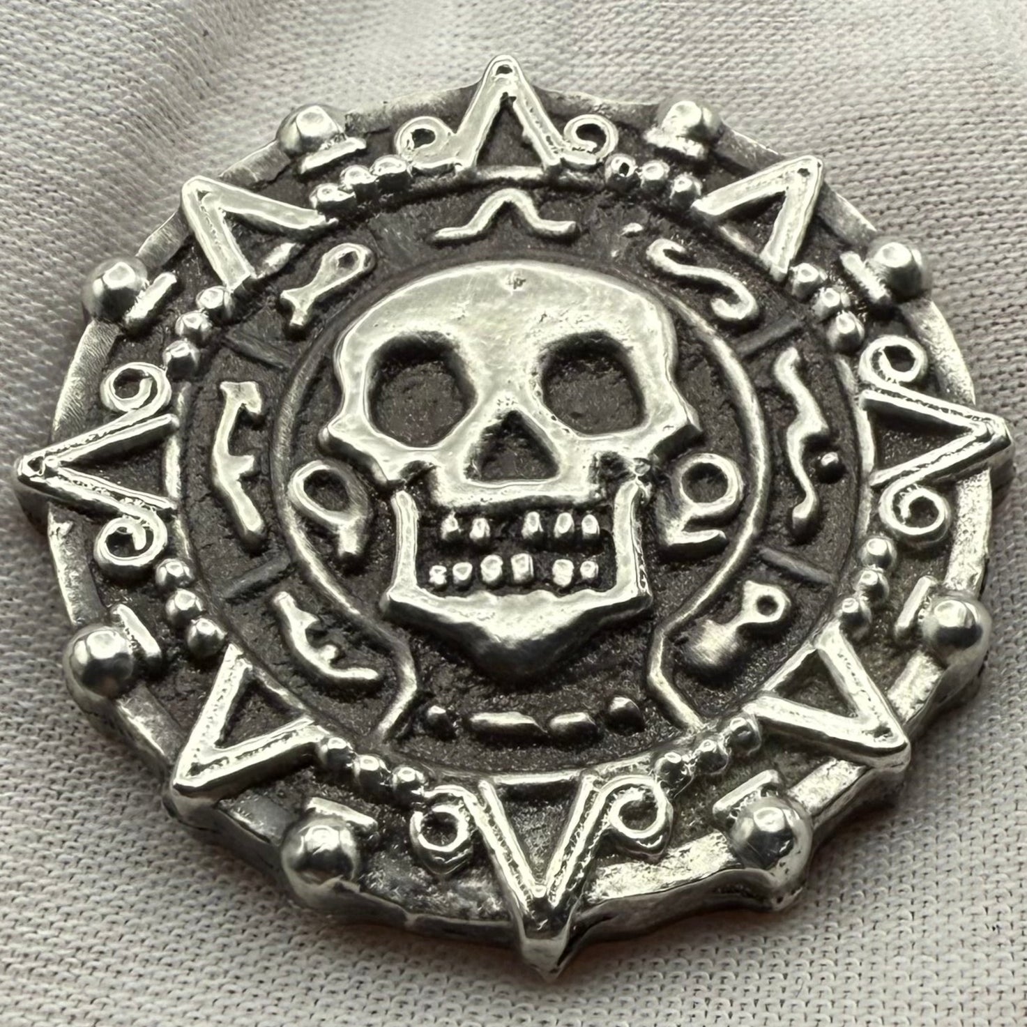 This beautiful pirate treasure 'Aztec Silver Doubloon' is a double sided skull design carefully handcrafted in 2025 by Peculiar Coins using 1.5 Troy Ounces of pure silver (.999) with antique finish. This peculiar pirate treasure is a popular choice for collectors and pirate enthusiasts.