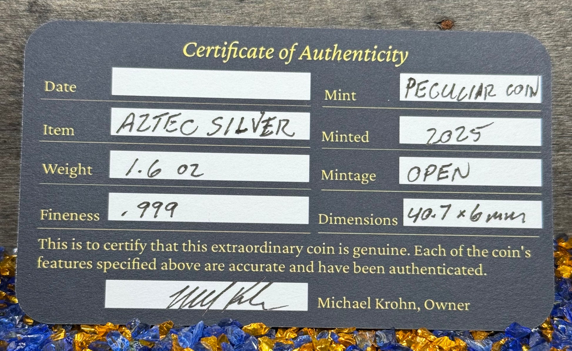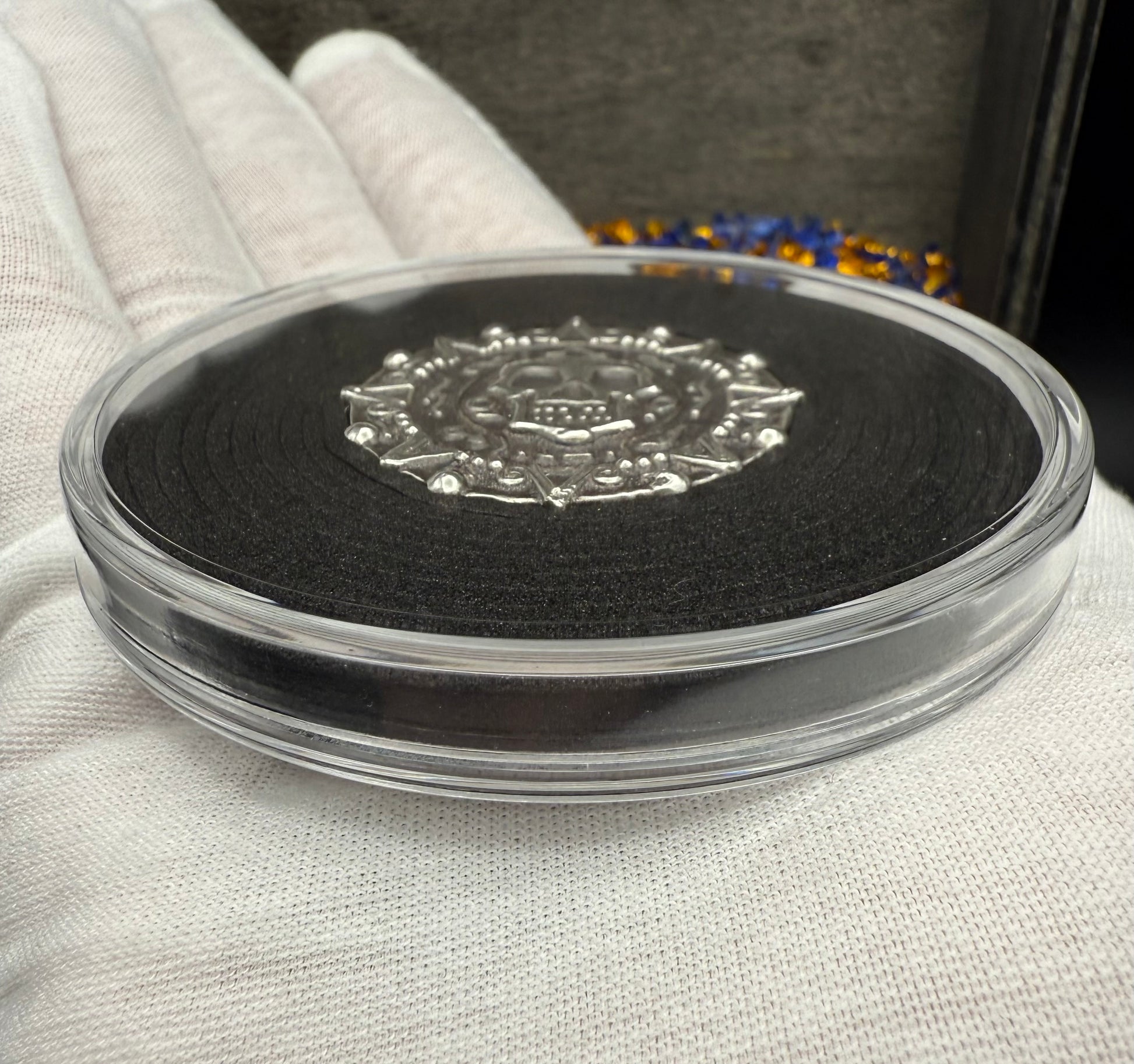 'Aztec Silver Doubloon' Pirate Treasure Hand Crafted by Peculiar Coins 1.5 Troy Ounce .999 Fine Silver Double Sided Skull Antique Finish Includes Wood Treasure Chest, Capsule & COA Mint Condition