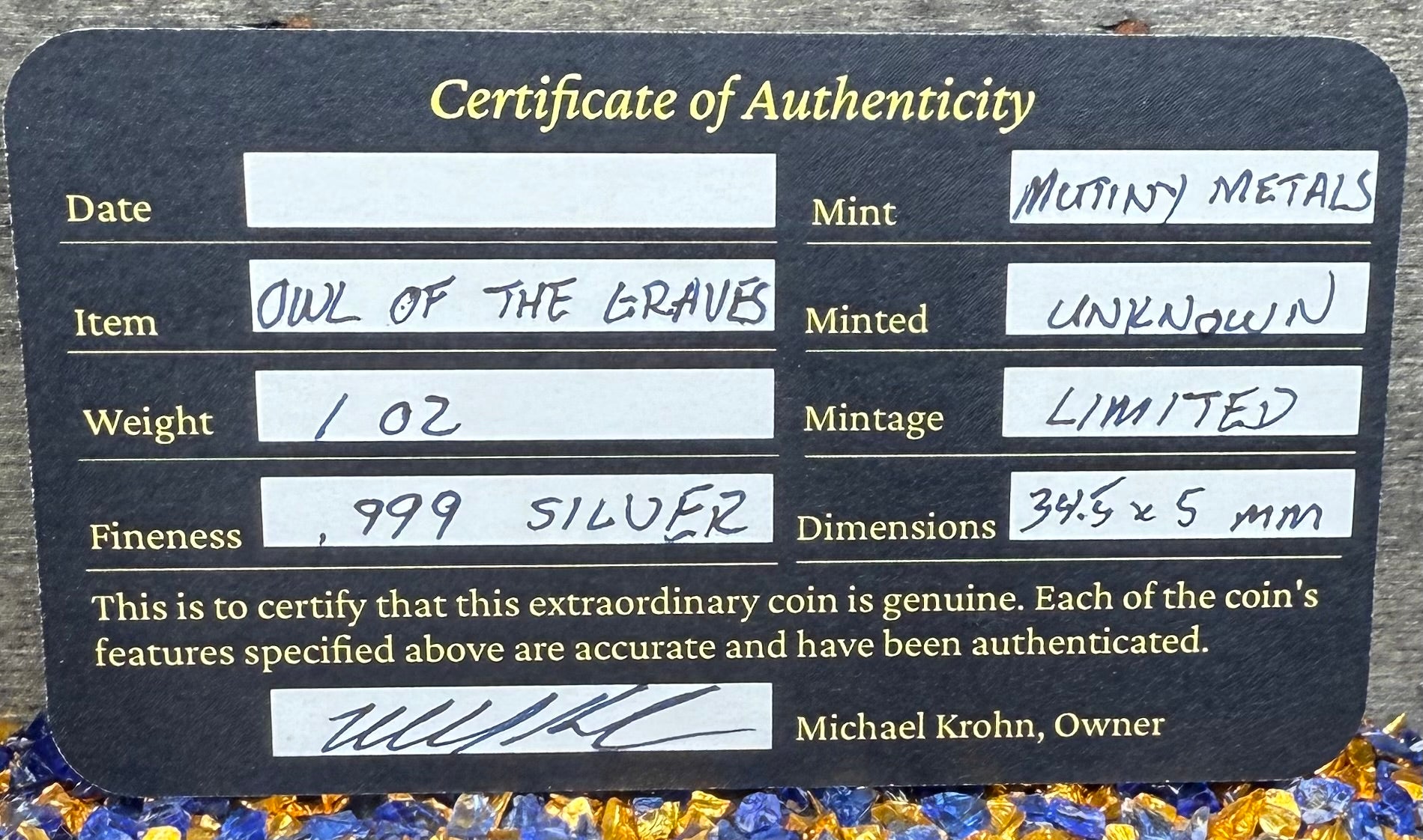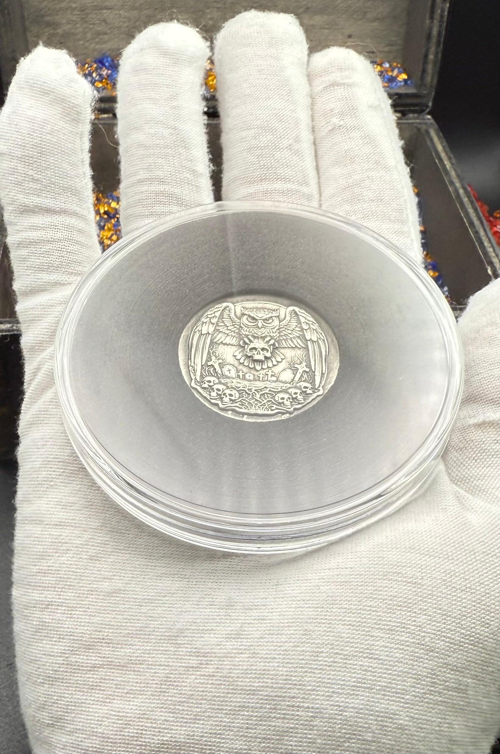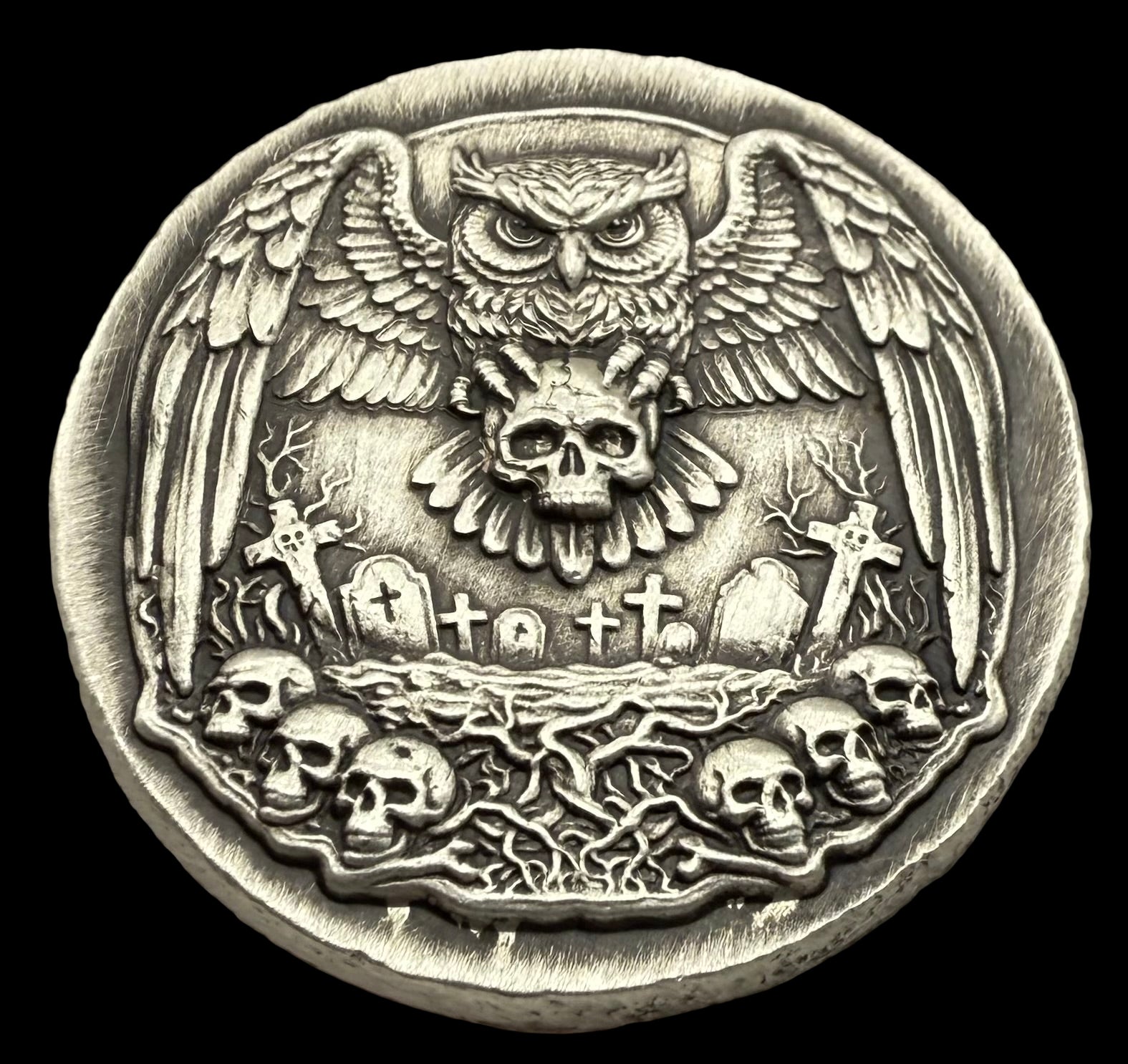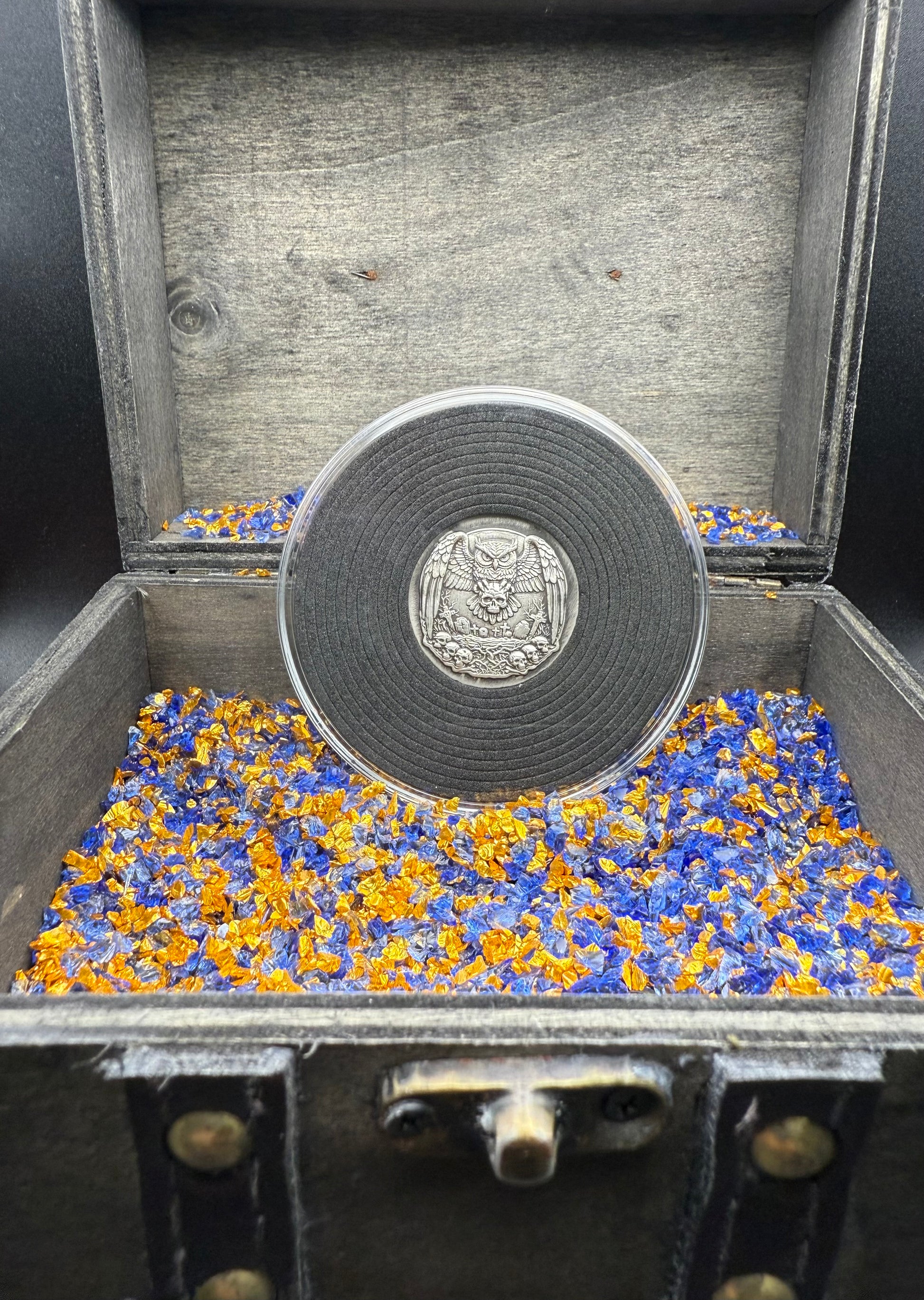 'Owl Amongst The Graves' Hand Crafted by Mutiny Metals 1 Troy Ounce .999 Fine Silver Round High Relief Antique Finish Includes Wood Treasure Chest, Capsule & COA. Limited Edition