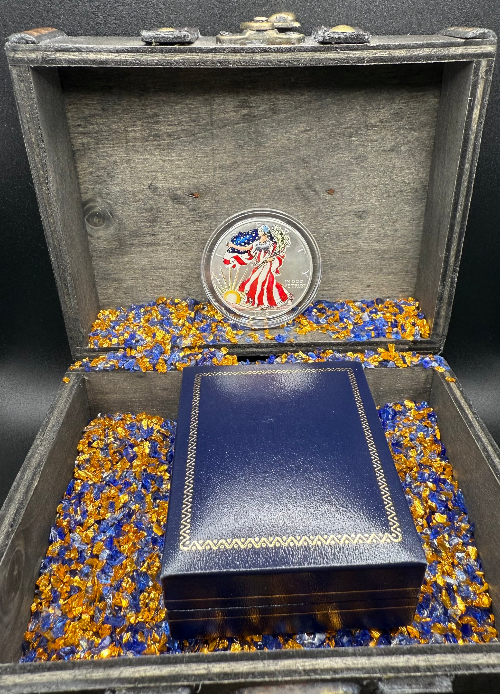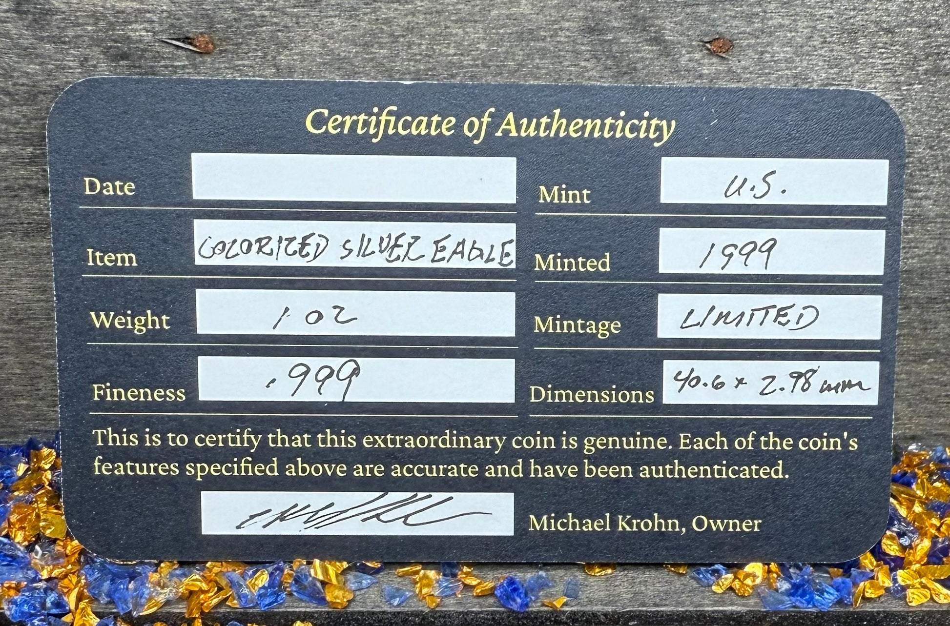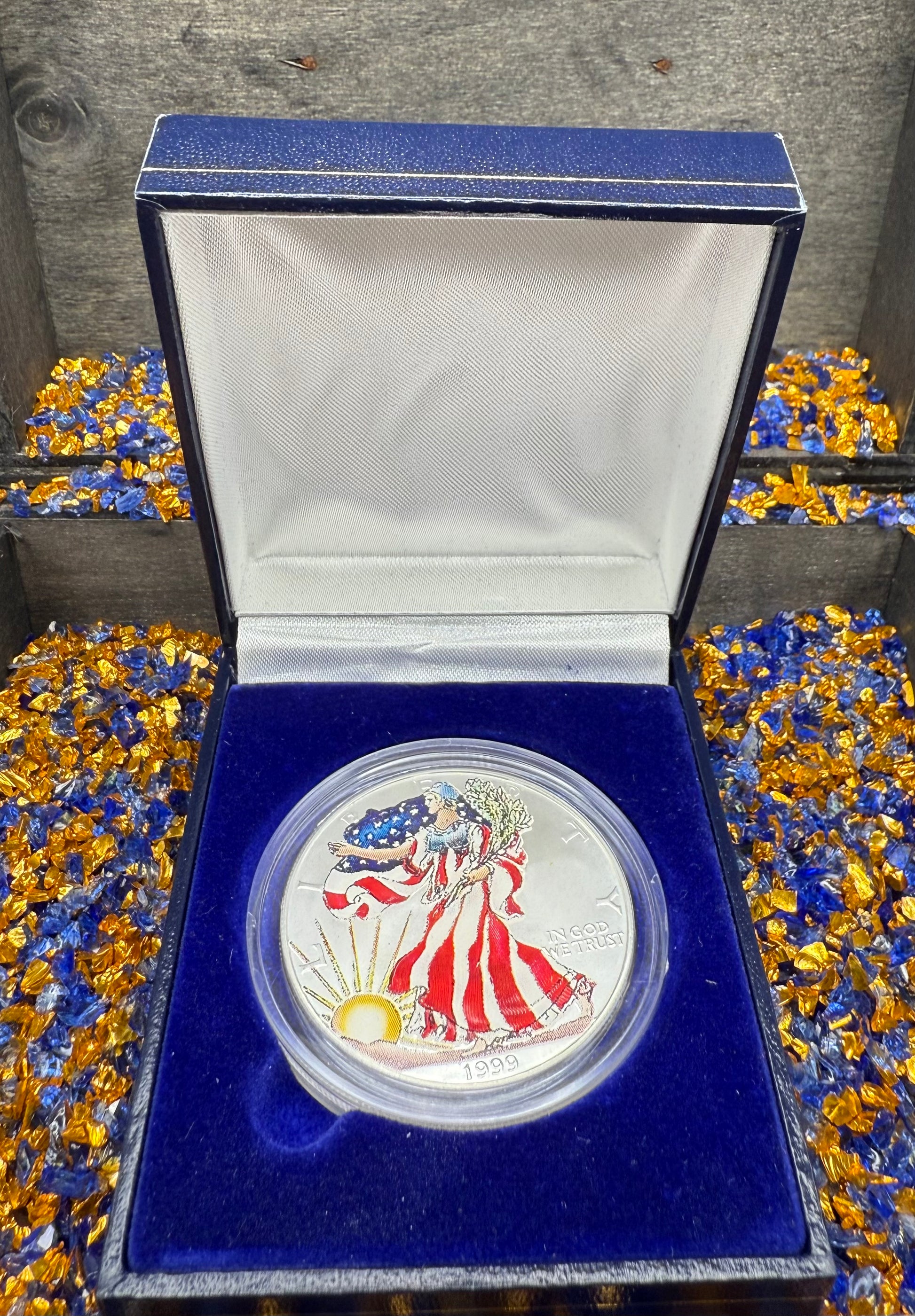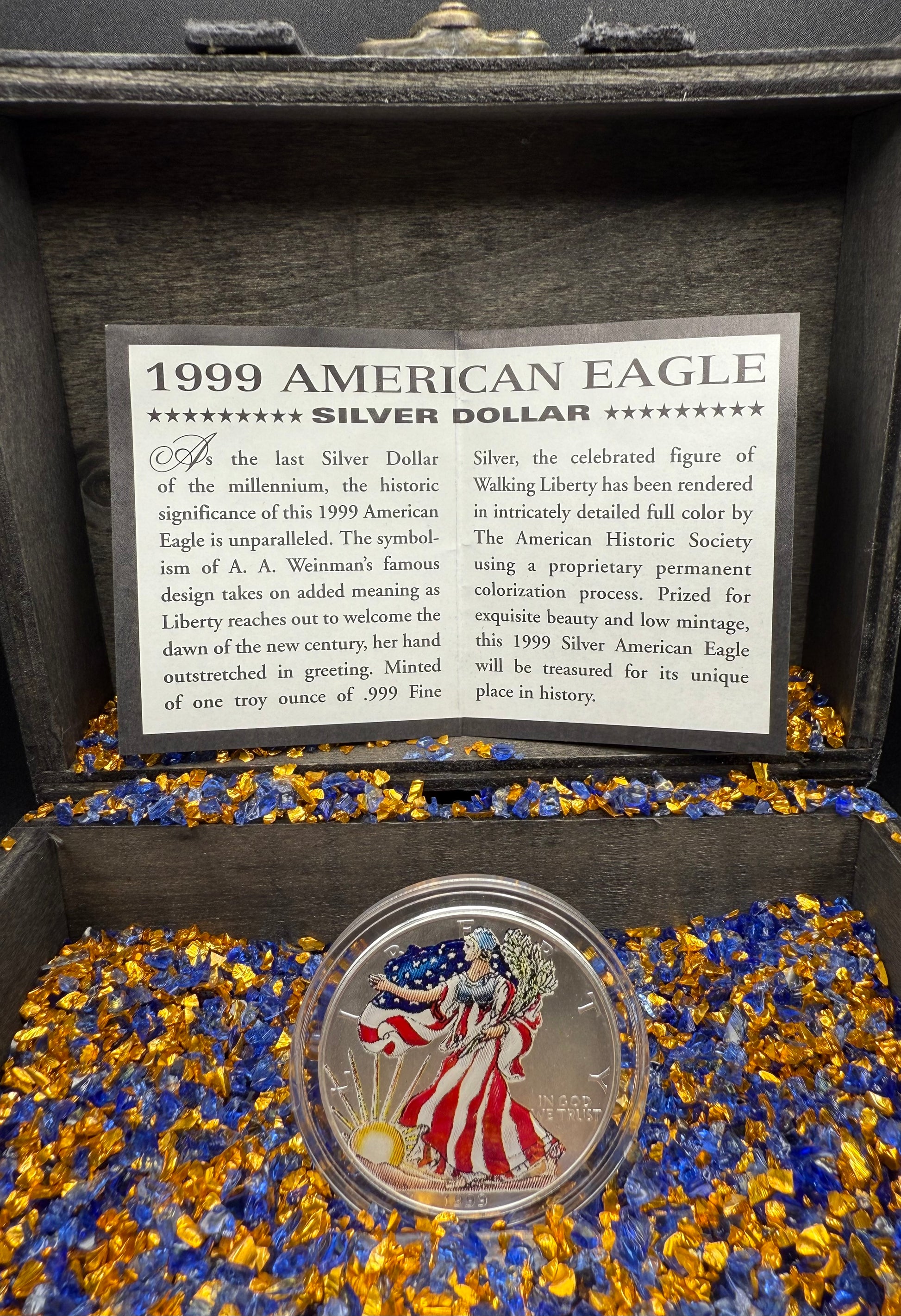 Colorized Hand Painted 1999 $1 American Silver Eagle Coin Brilliant Uncirculated Excellent Condition Satin Finish Includes New Capsule, COA, Coin Box & Wooden Treasure Box