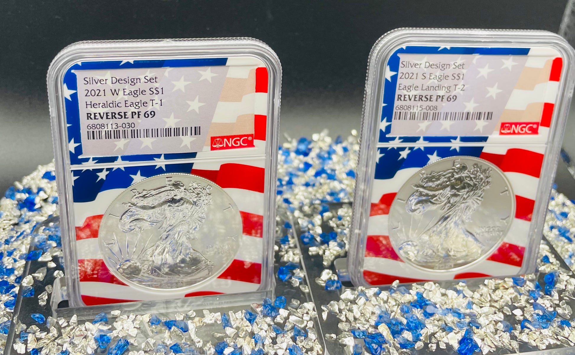 This rare matching coin set consists of two certified 2021 (Type 1 and Type 2) West Point and San Francisco PF69 American Silver Eagles struck nearly perfectly and received a stunning near highest grade by the NGC. This simple yet elegant set is in mint condition with a reverse proof finish and encased in  beautiful American Flag holders.