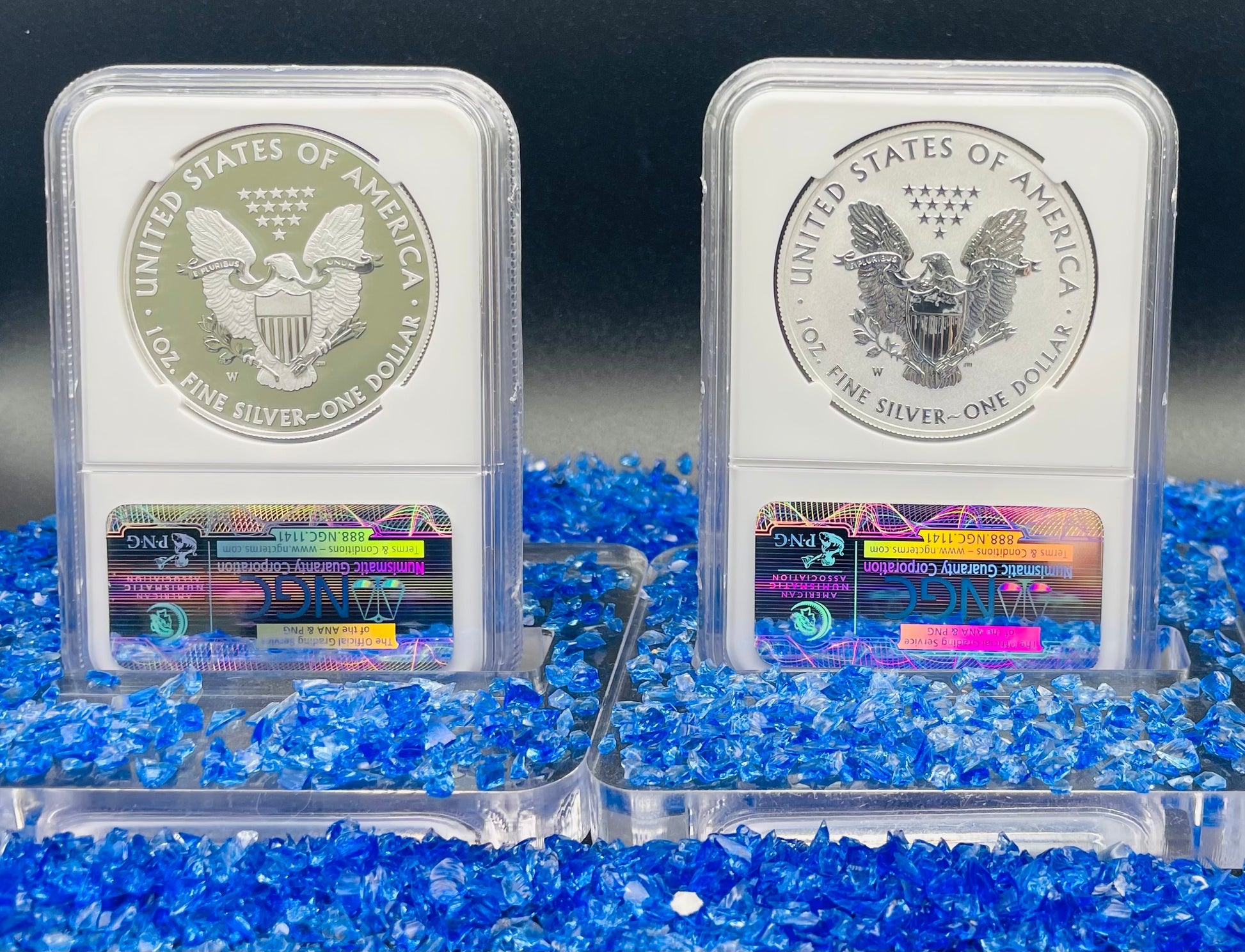 This rare coin set consists of two certified 2013 West Point PF69 American Silver Eagles struck nearly perfectly and received a stunning near highest grade by the NGC. This simple yet elegant set is in mint condition with a reverse proof and enhanced finish encased in a beautiful white core with a rare West Point Gold Star Label.