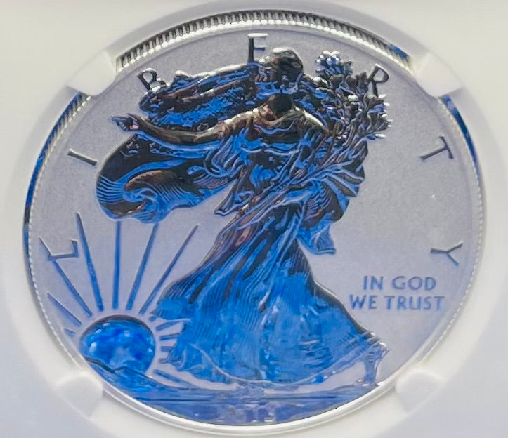 For those who love American coinage, this piece is a fantastic option. The obverse bears the image of Lady Liberty. She has her right hand extended out in front of her while she carries branches of laurel and oak in the left. In the lower left, the sun sets on the horizon. The word "LIBERTY" is inscribed along the rim, and the words "IN GOD WE TRUST" are inscribed at the right. The mintage year is included at the bottom.