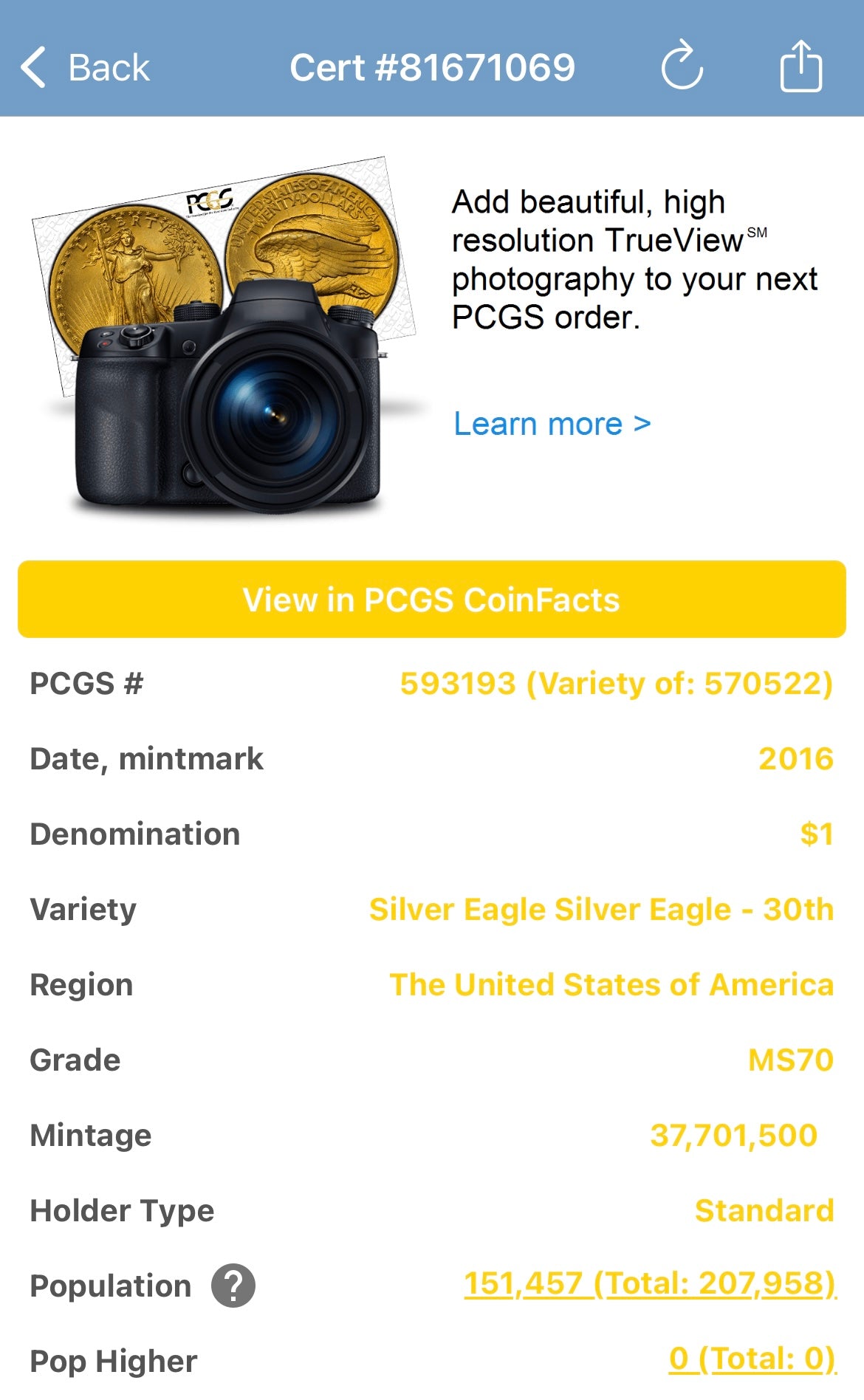 This exceptional certified 2016 MS70 American Silver Eagle coin was struck perfectly and received a stunning highest grade by the PCGS. This simple yet elegant piece is in mint condition. Holder is new with no marks or scratches.
