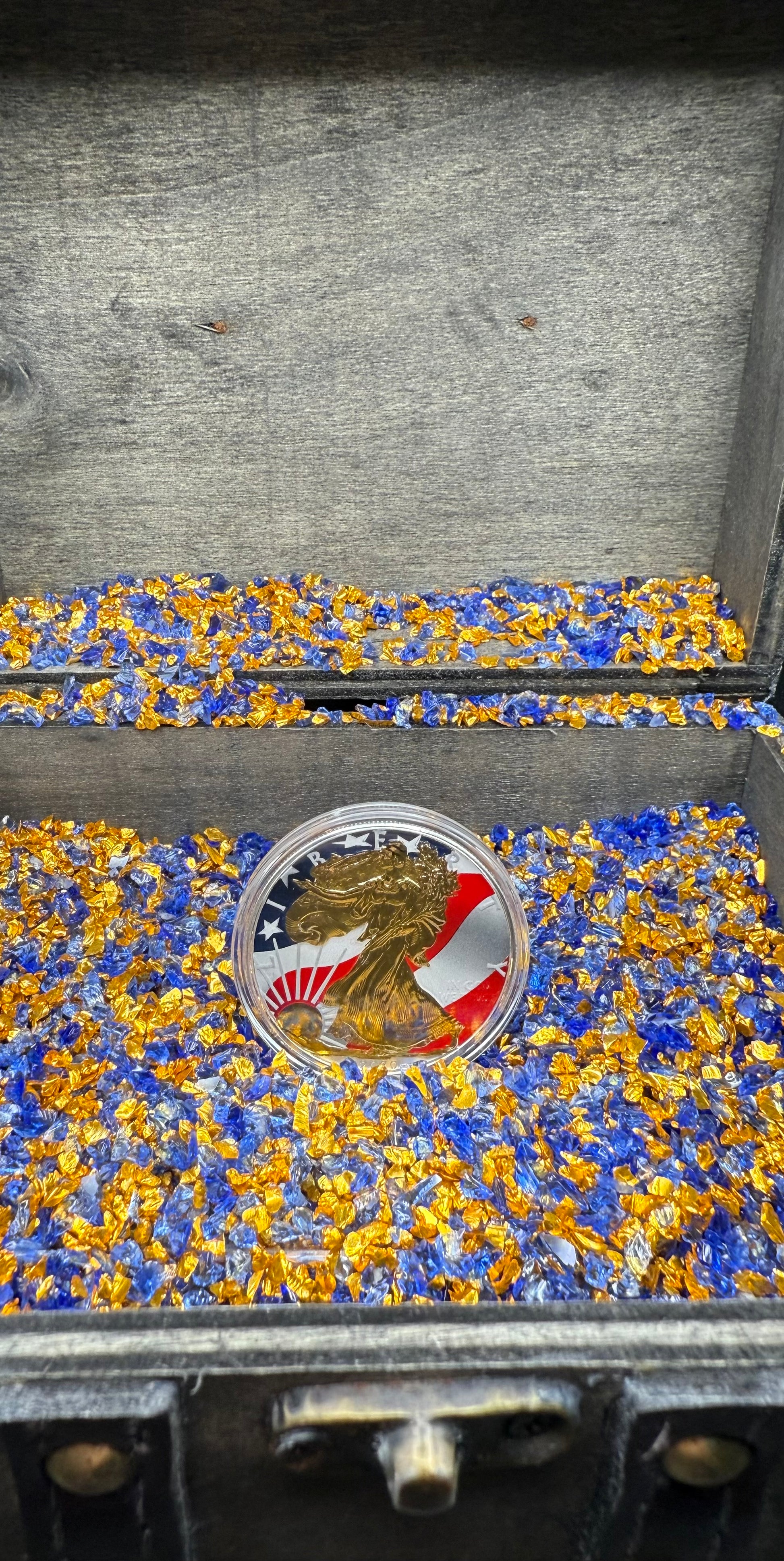 Colorized Gold Gilded Lady Liberty 2020 $1 American Silver Eagle Coin Brilliant Uncirculated Excellent Condition Satin Finish Includes New Capsule, COA, Littleton Box & Wooden Treasure Box