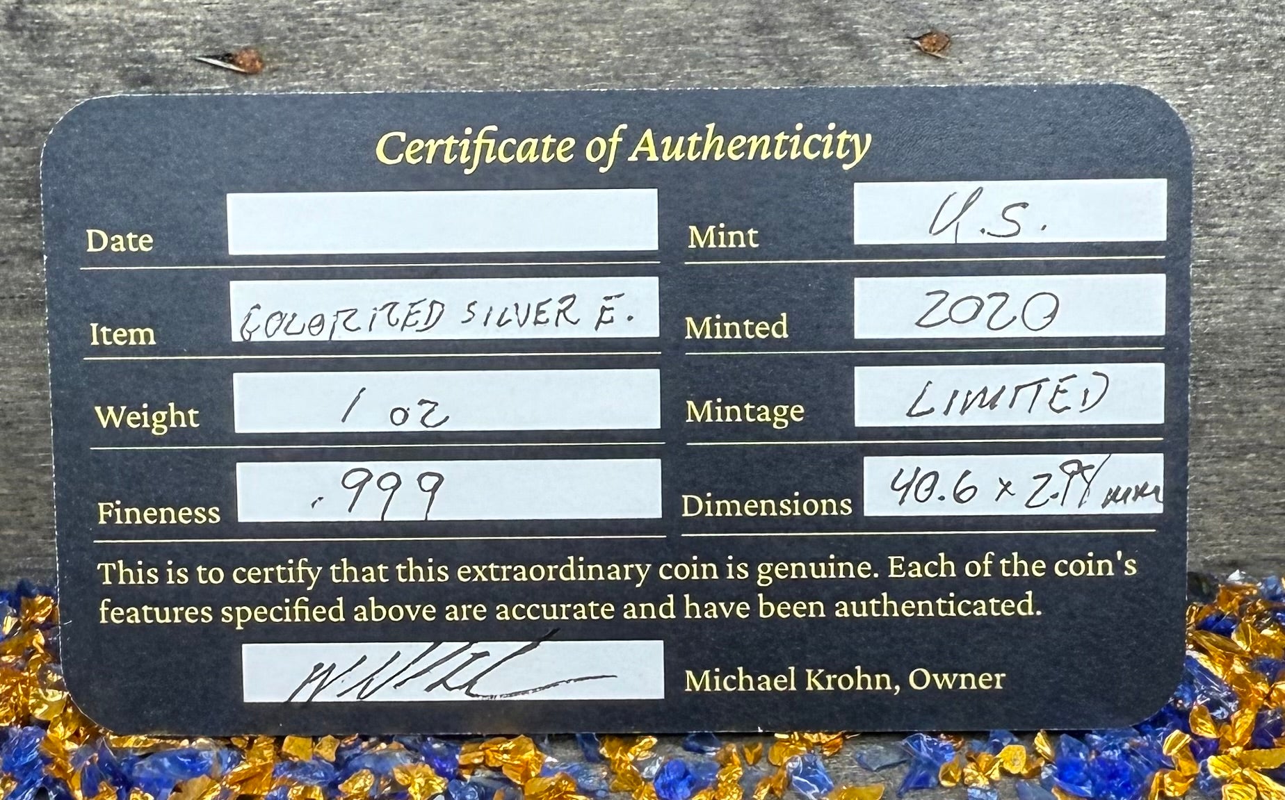 This resolute coin comes with a Certificate of Authenticity, a new spare ultra clear polypropylene capsule (Acid Free / No PVC) protecting it from dust, dirt, and scratches. This piece comes gift wrapped and shipped in a mini Littleton box, and a larger wooden treasure box great for gift giving. Acrylic stand and acrylic colored stones are not included.