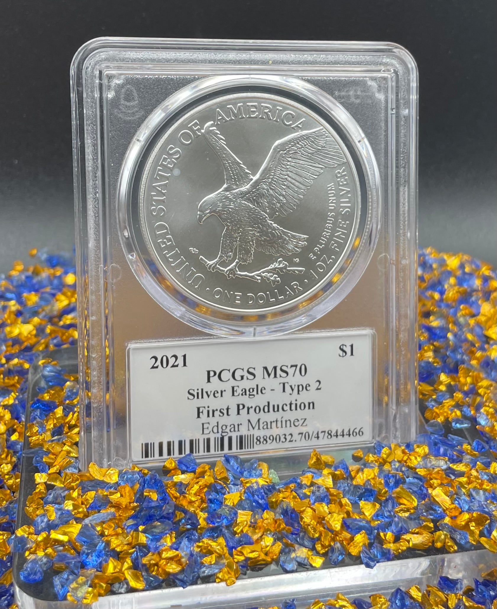 This exceptional certified 2021 Type 2 MS70 First Production American Silver Eagle coin was struck perfectly and received a stunning highest grade by the PCGS. This simple yet elegant piece is in very good condition (1 small spot at obverse) signed by MLB Hall of Famer Edgar Martinez. Low mintage of 207 makes this an excellent addition to any collection.