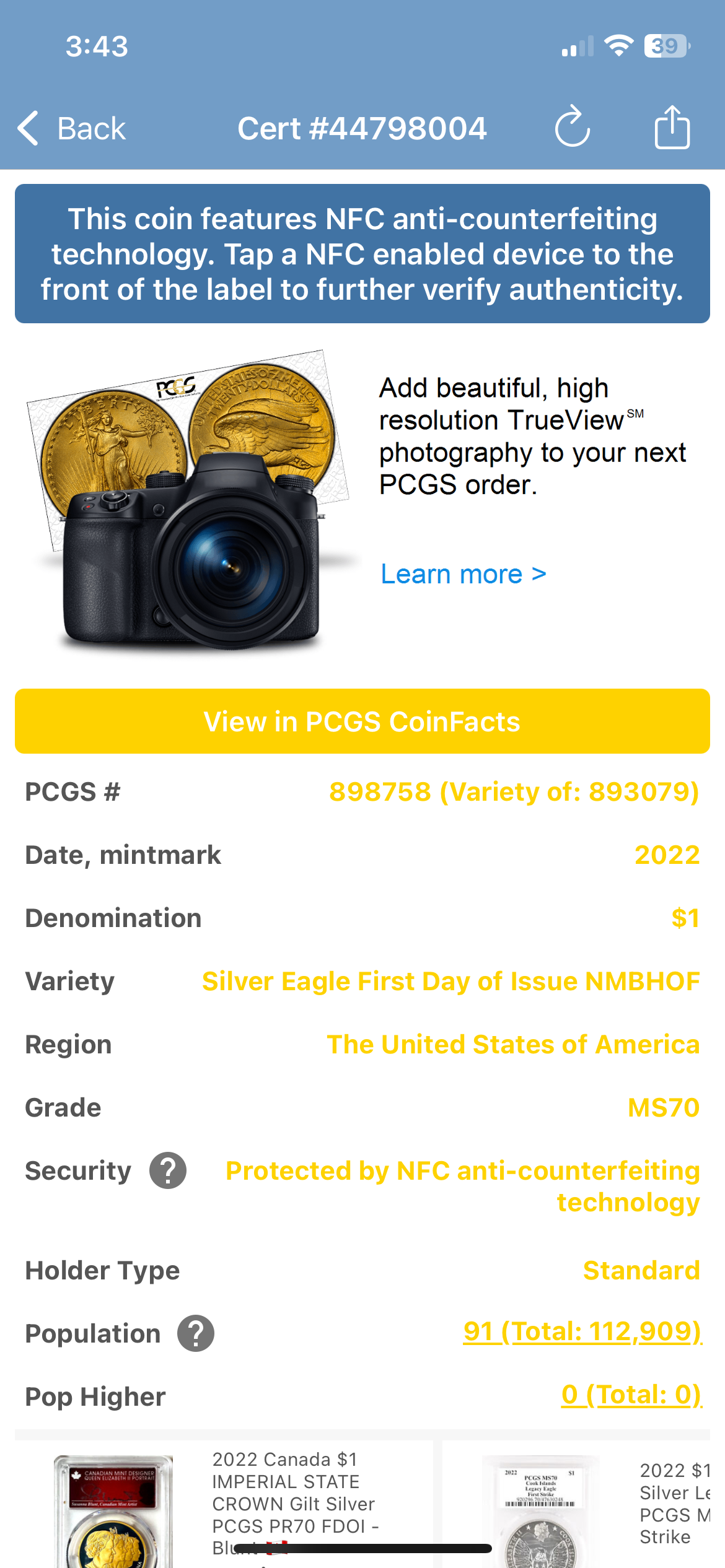 The holder has been micro chipped by PCGS for authentication validation purposes. We tapped the holder against the phone using the PCGS app revealing a green validation notification as displayed in the listing photos.
