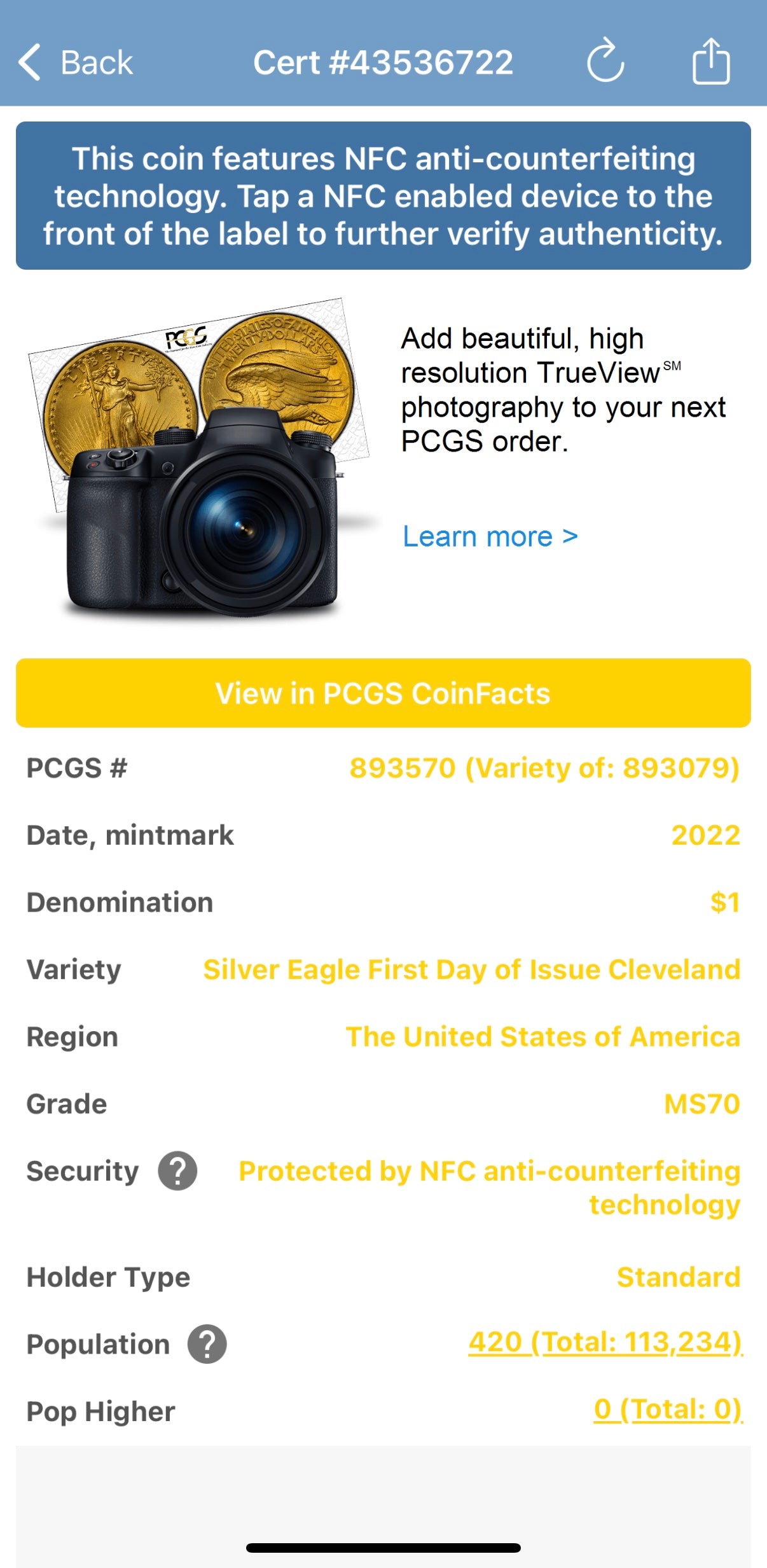 This exceptional certified 2022 MS70 American Silver Eagle coin was struck perfectly and received a stunning highest grade by the PCGS. This simple yet elegant piece is in mint condition with no spots and no toning. Holder is in excellent condition with no marks and no scratches. Thomas Cleveland signed label and low mintage of 420 makes this an excellent addition to any collection.