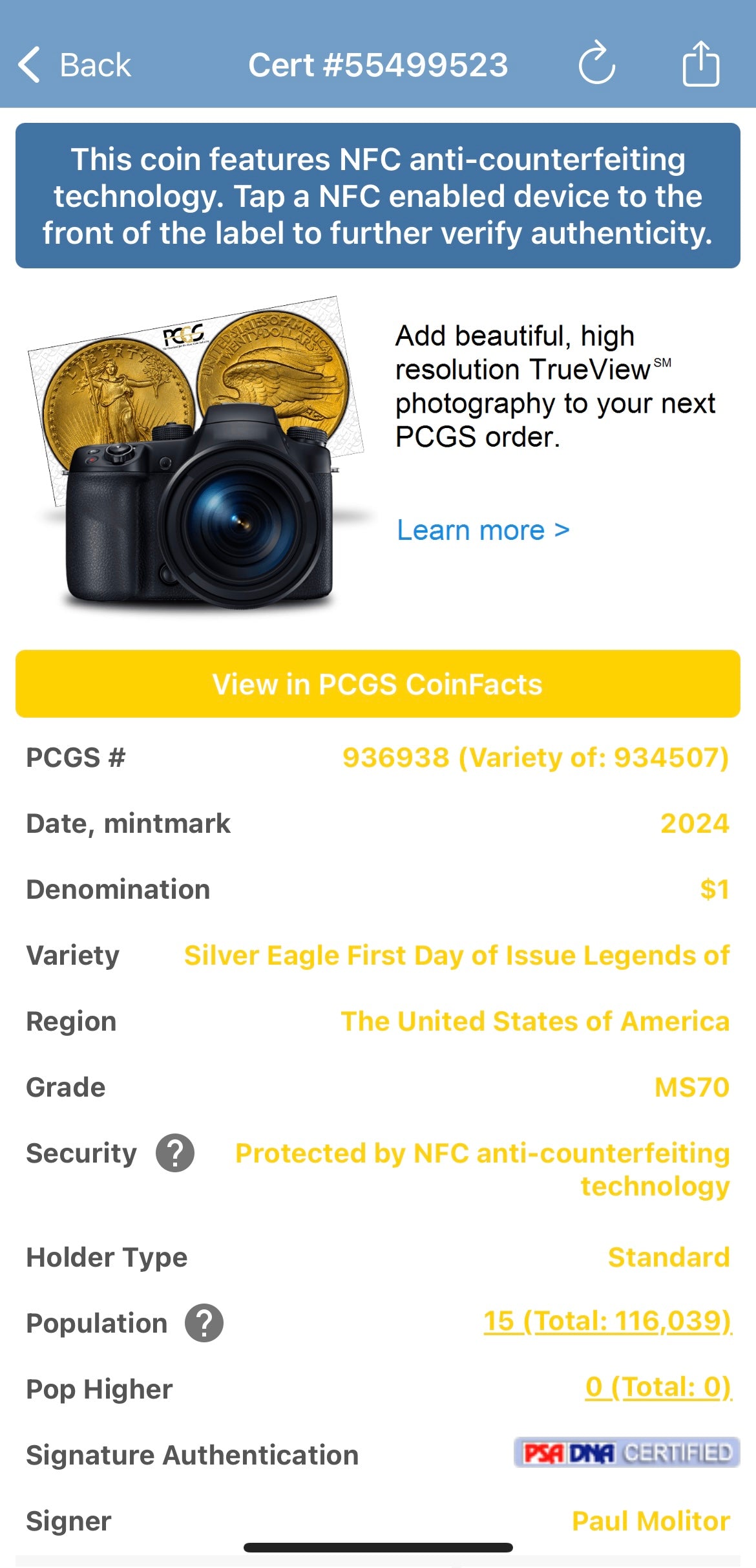 The holder has been micro chipped by PCGS for authentication validation purposes. We tapped the holder against the phone using the PCGS app revealing a green validation notification as displayed in the listing photos.