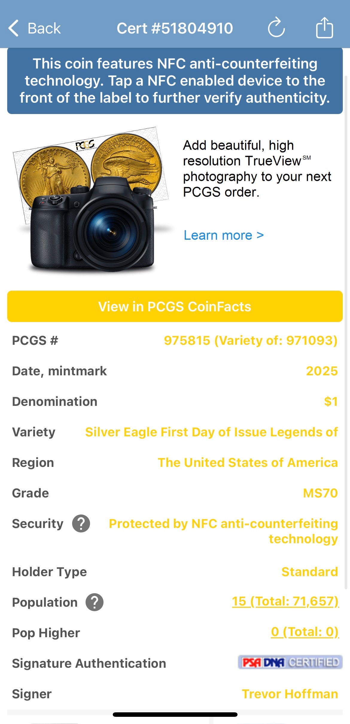 This exceptional certified 2025 MS70 American Silver Eagle coin was struck perfectly and received a stunning highest grade by the PCGS. This simple yet elegant piece is in near mint condition (tiny spot at obverse) signed by MLB Hall of Famer Trevor Hoffman. Low mintage of 15 makes this piece an excellent addition to any collection.