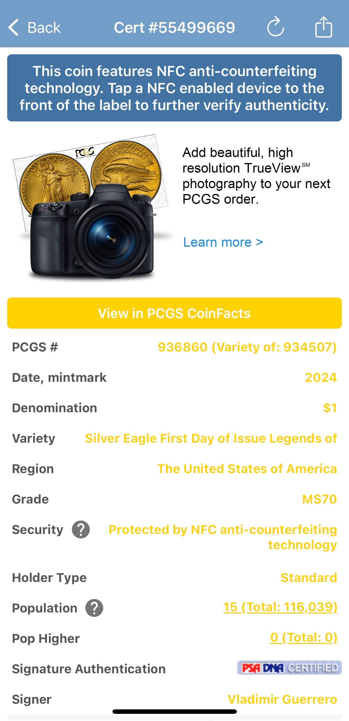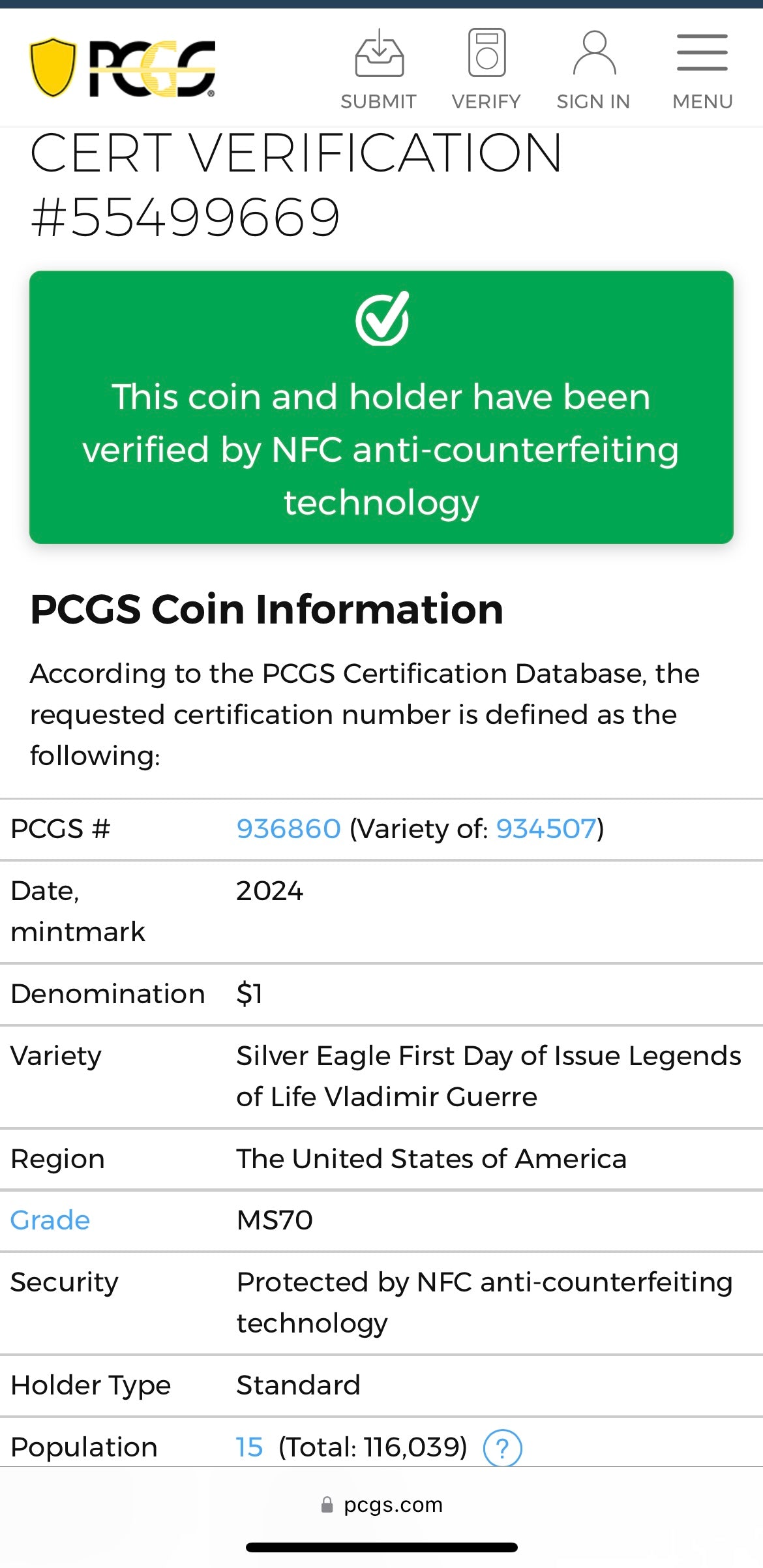 The holder has been micro chipped by PCGS for authentication validation purposes. We tapped the holder against the phone using the PCGS app revealing a green validation notification as displayed in the listing photos.