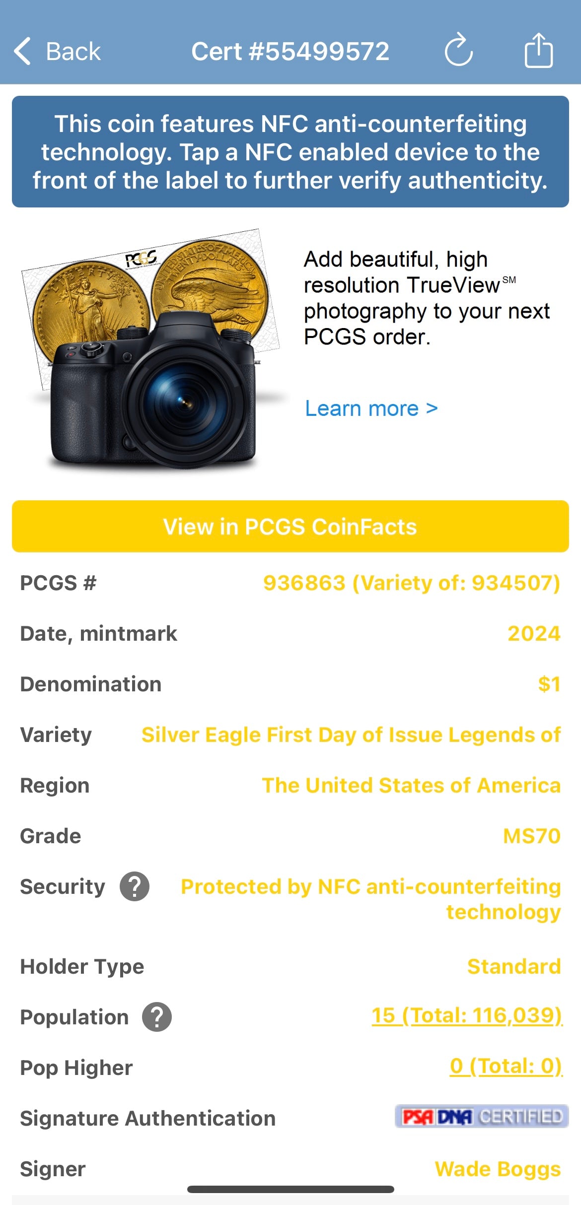 The holder has been micro chipped by PCGS for authentication validation purposes. We tapped the holder against the phone using the PCGS app revealing a green validation notification as displayed in the listing photos.