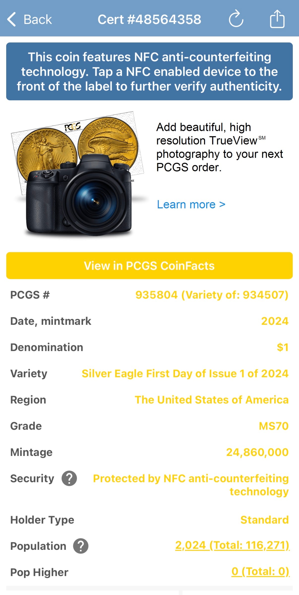 The holder has been micro chipped by PCGS for authentication validation purposes. We tapped the holder against the phone using the PCGS app revealing a green validation notification as displayed in the listing photos.
