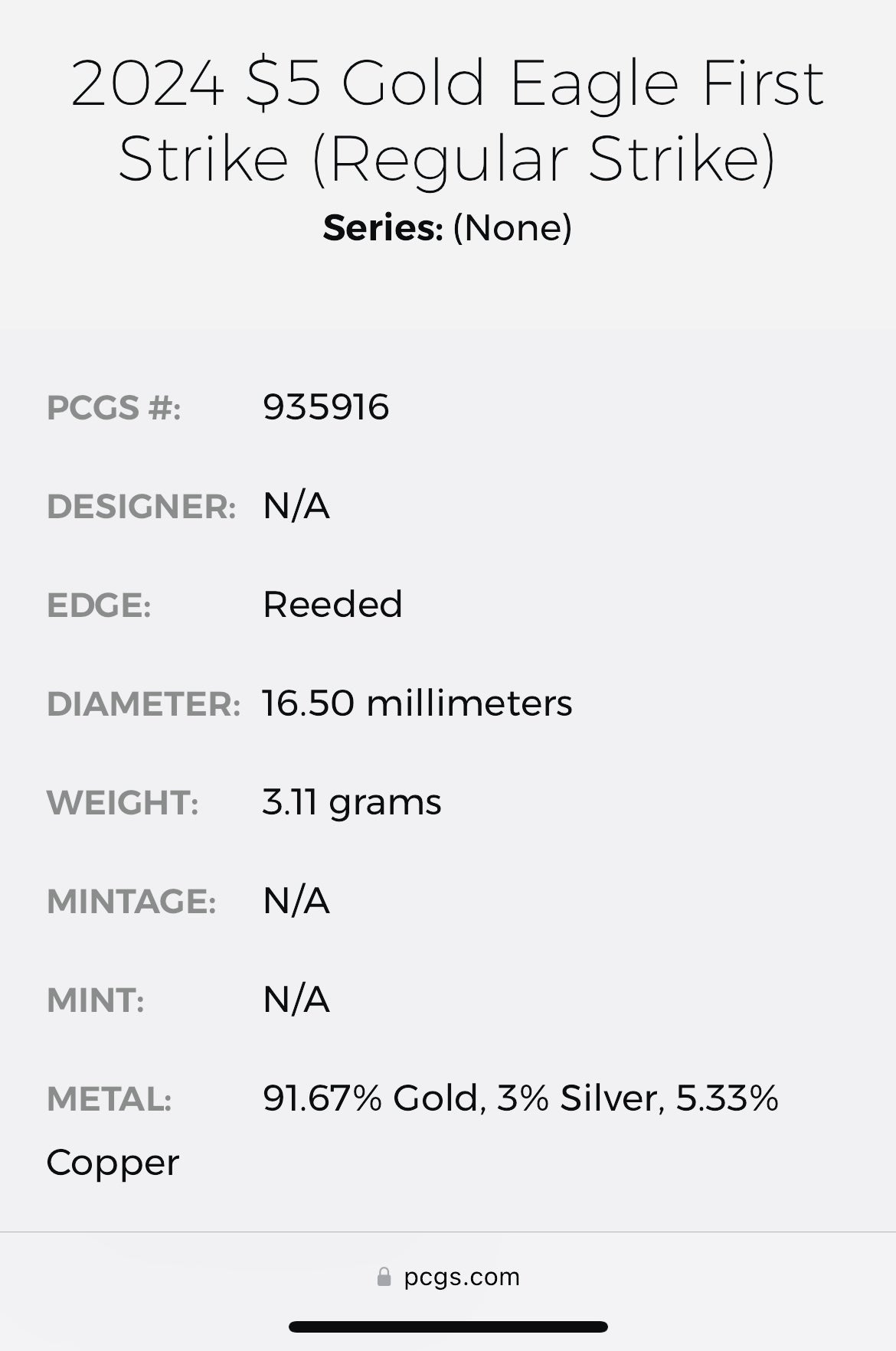 2024 $5 American Gold Eagle PCGS MS70 First Strike Flag Label (Rare 1 of 1,232)