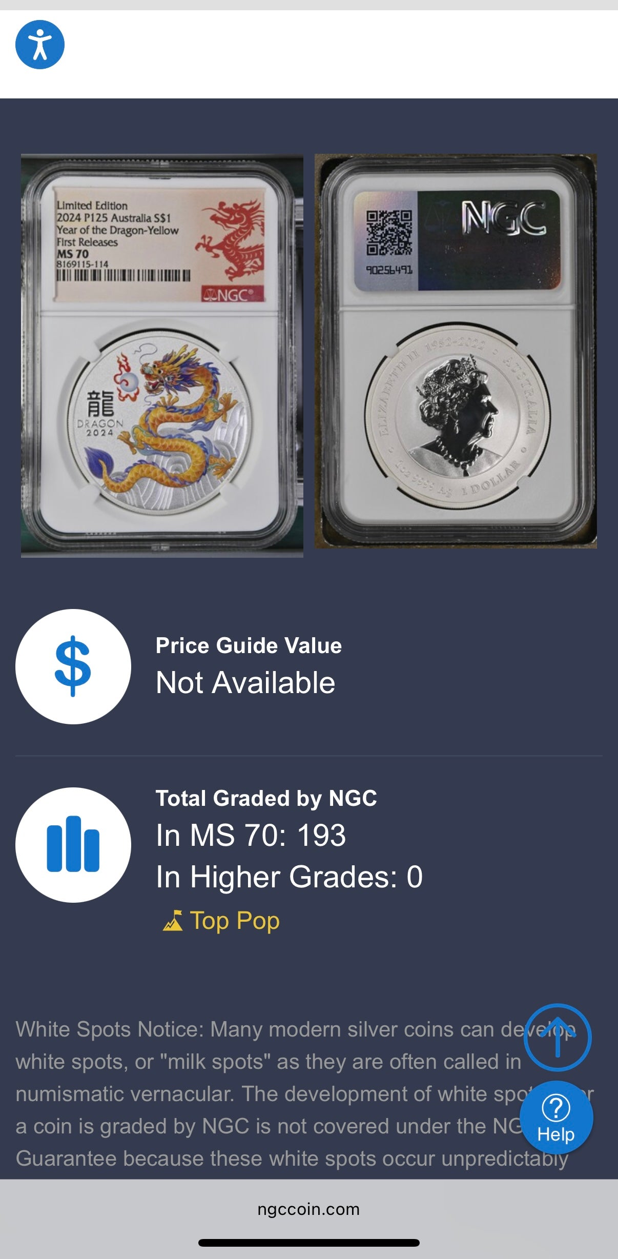 This exceptional certified 2024 P125 Silver $1 Australia Lunar Series III MS70 Year of the Drago (Yellow Colorized) coin was struck perfectly and received a stunning highest grade by the NGC. This piece features the rare Limited Edition red lunar series label with First Releases designation. This simple yet elegant limited edition piece (1 of 193) is in mint condition and comes in a beautiful satin finish with new holder.