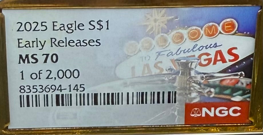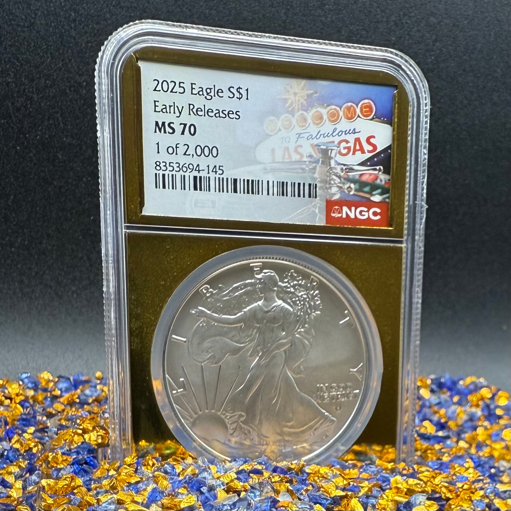 2025 $1 American Silver Eagle NGC MS70 Early Releases Vegas Label Gold Foil Rare 1 of 2,000 Mint