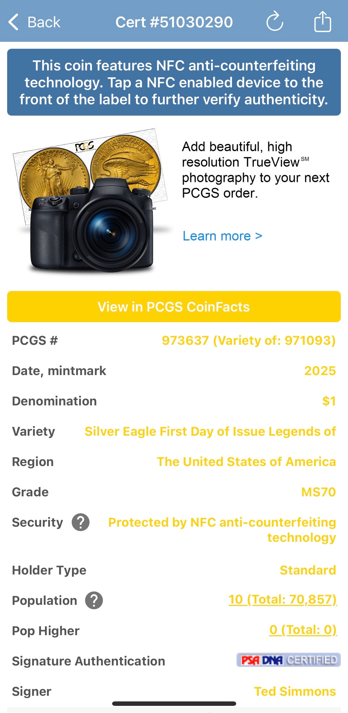This exceptional certified 2025 MS70 American Silver Eagle coin was struck perfectly and received a stunning highest grade by the PCGS. This simple yet elegant piece is in mint condition signed by MLB Hall of Famer Ted Simmons. Low mintage of 10 makes this piece an excellent addition to any collection.