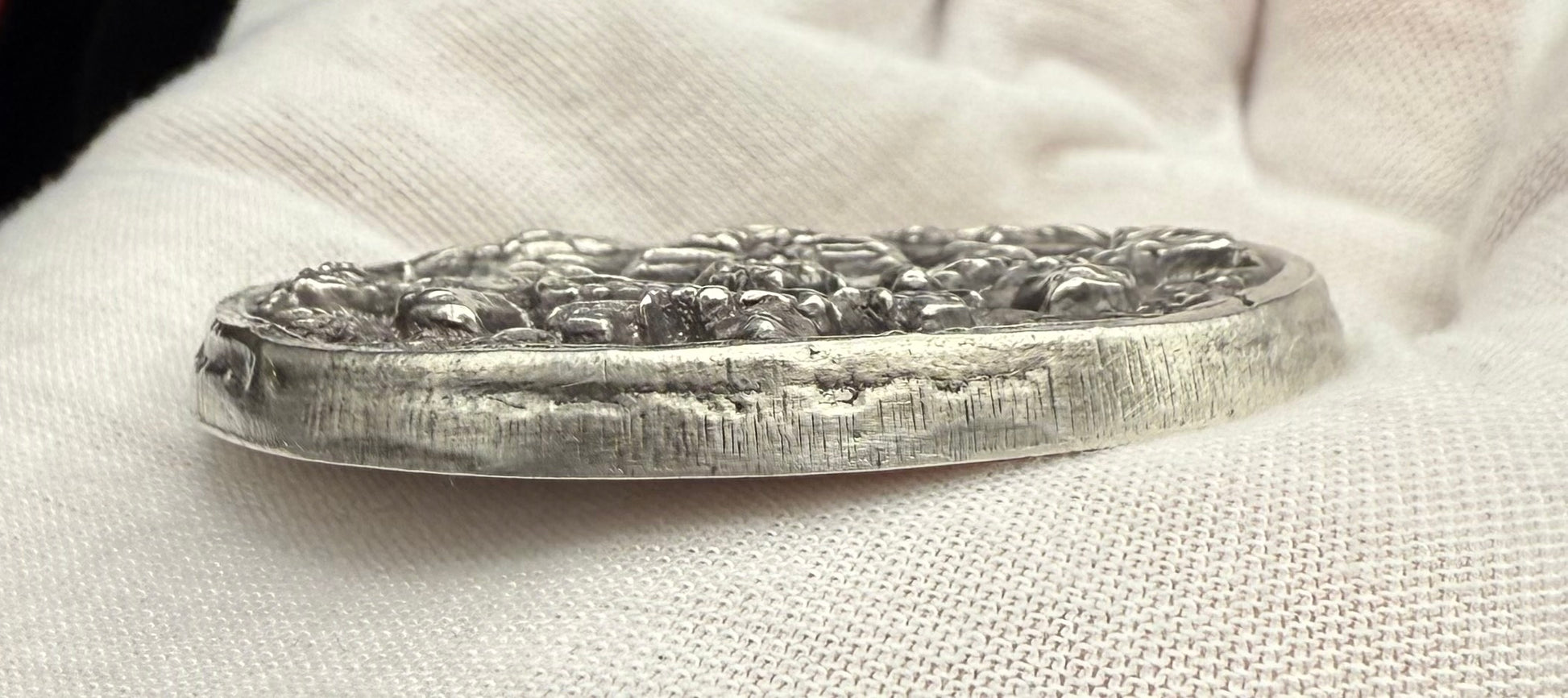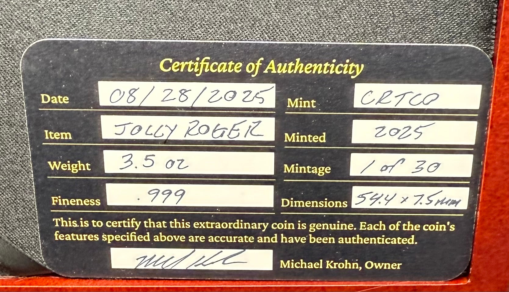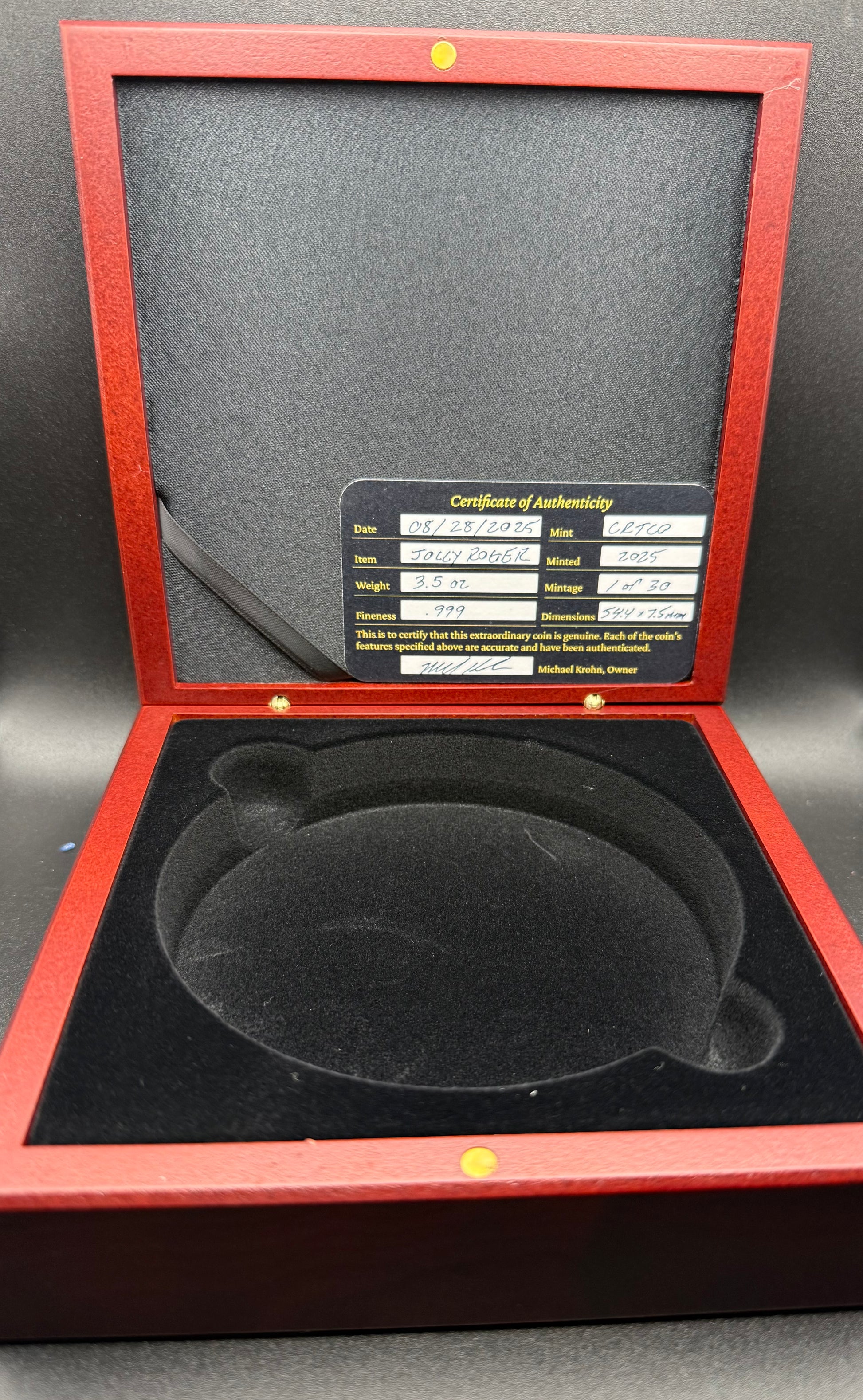 This beautiful limited edition pirate treasure features 'The Jolly Roger' presented by Peculiar Coins. This authentic ultra-high relief piece captures an intense pirate in a captain's hat with dual swords ready for battle. This piece is carefully hand crafted in 2025 using 3.5 Troy Ounces of pure silver (.999) in antique finish. This peculiar pirate treasure is a popular choice for collectors and pirate enthusiasts. Low mintage of only 30 makes this rare piece an excellent addition to any collection.
