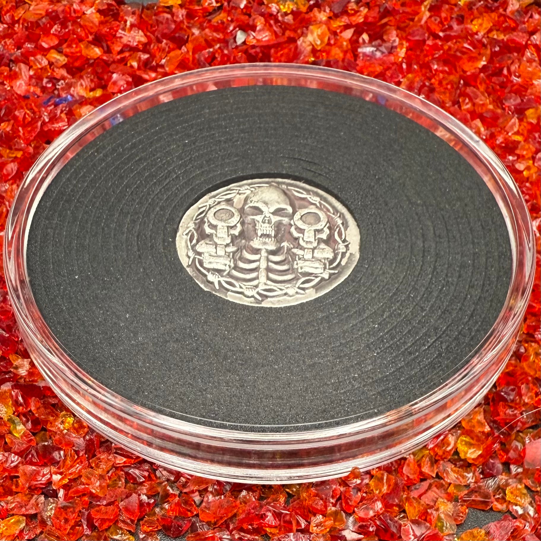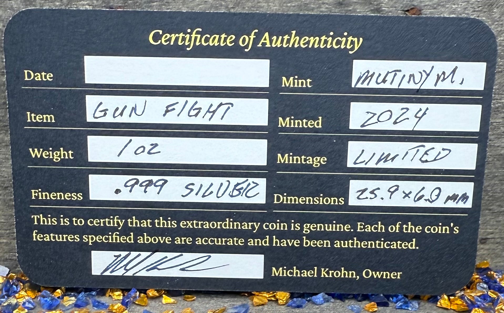 This unique limited edition piece 'Brought a Knife to a Gun Fight' is hand crafted in 2024 by Mutiny Metals using 1 ounce of fine silver (.999). This rare piece makes an excellent addition to any collection.