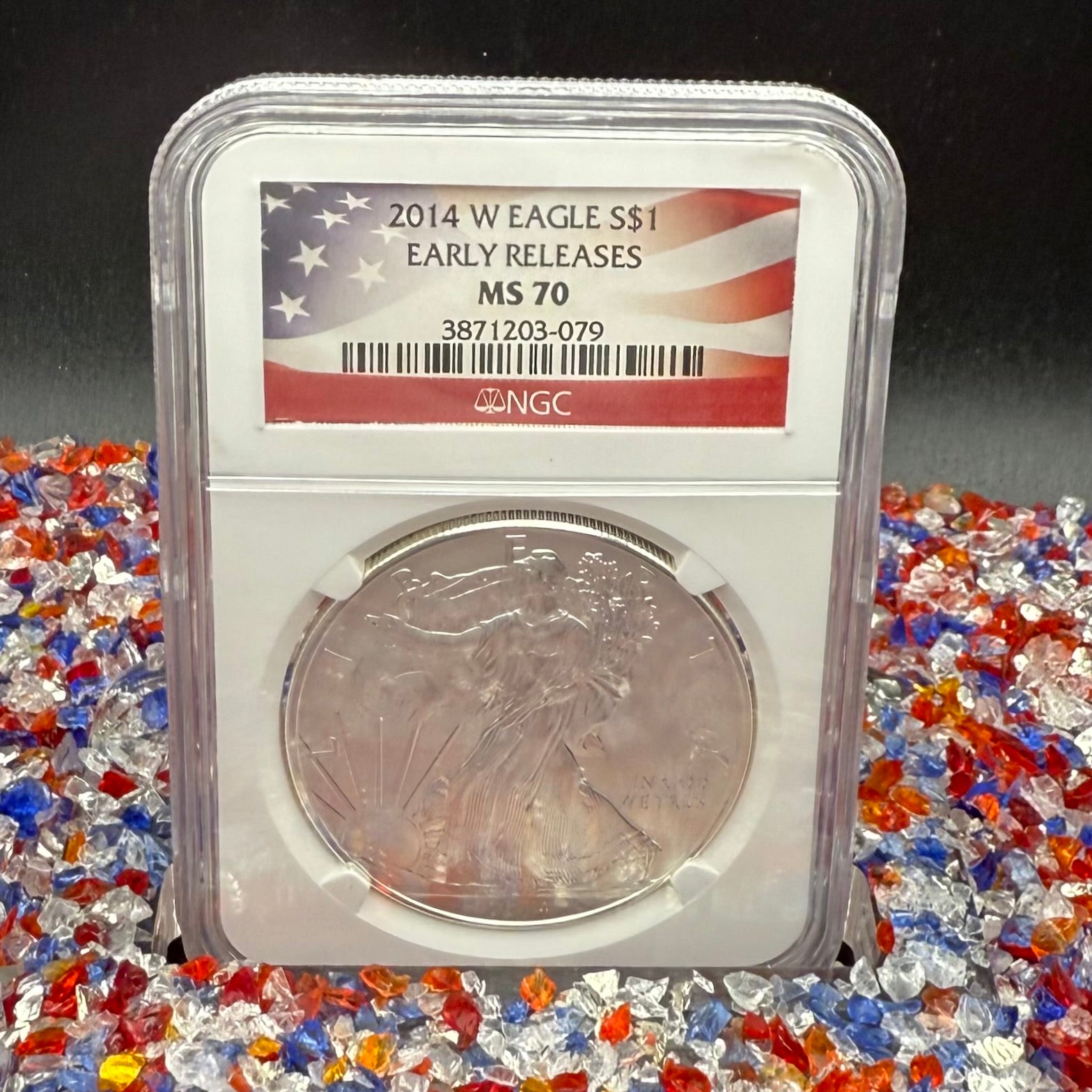 Burnished 2014 (W) $1 American Silver Eagle NGC MS70 Early Releases American Flag Label (1 of 6,552)