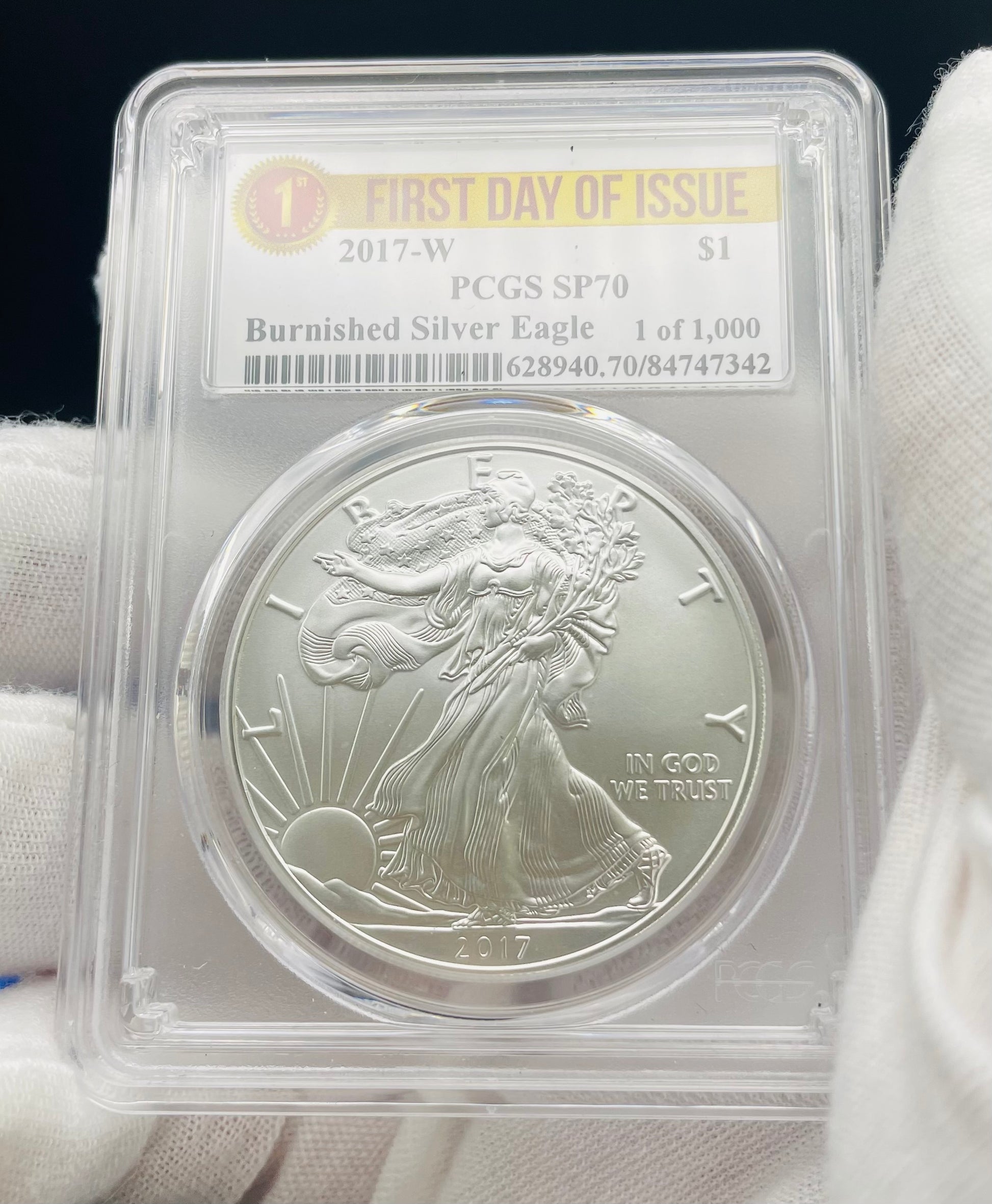 Burnished 2017 (W) $1 American Silver Eagle PCGS SP70 First Day of Issue Rare Label Mint Condition (1 of 1,000)