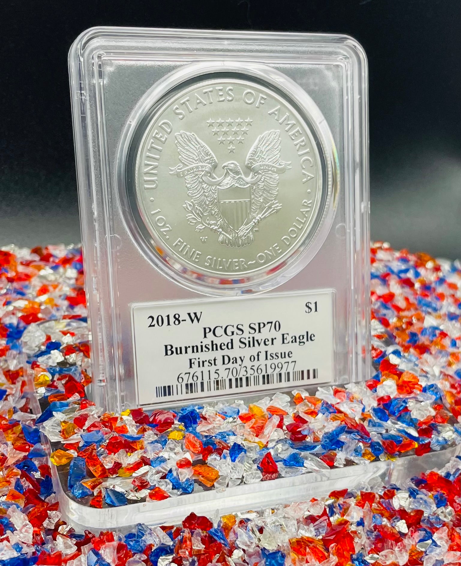 Burnished 2018 (W) $1 American Silver Eagle PCGS SP70 First Day of Issue John M. Mercanti Signed Label Mint Condition (1 of 150)