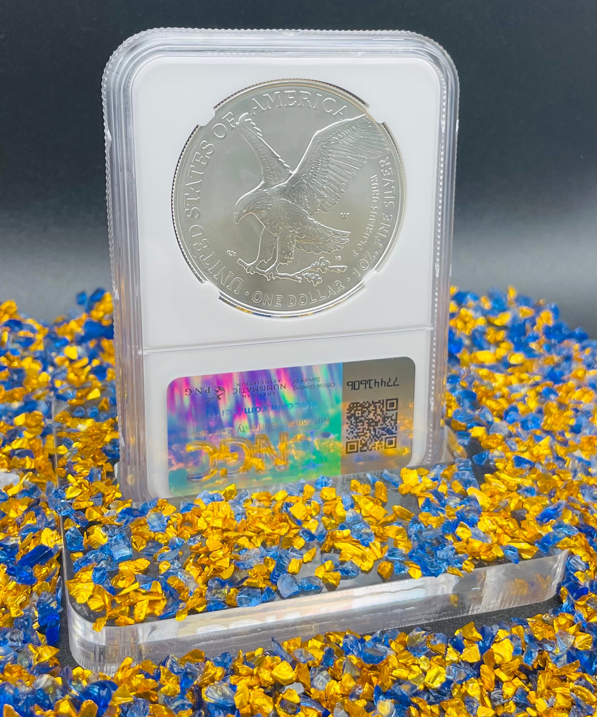 This exceptional certified 2022 West Point MS70 American Silver Eagle coin was struck perfectly and received a stunning highest grade by the NGC. This simple yet elegant piece is in near mint condition (holder has a couple light contact marks) with a burnished finish.
