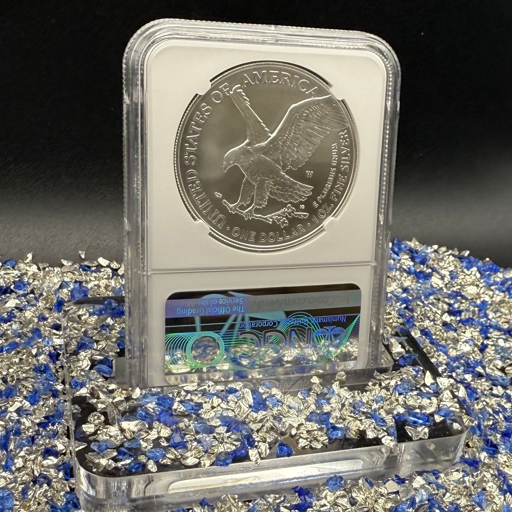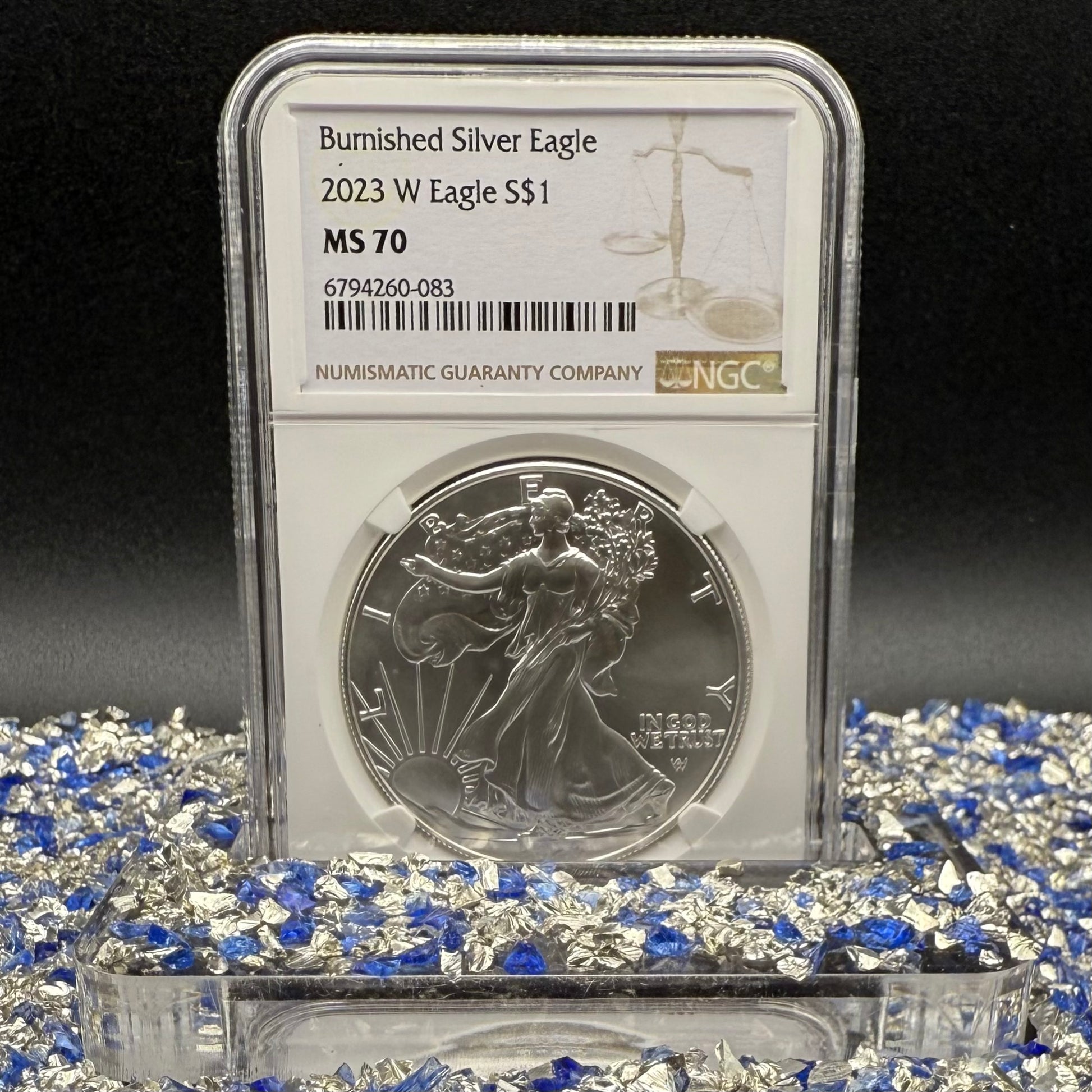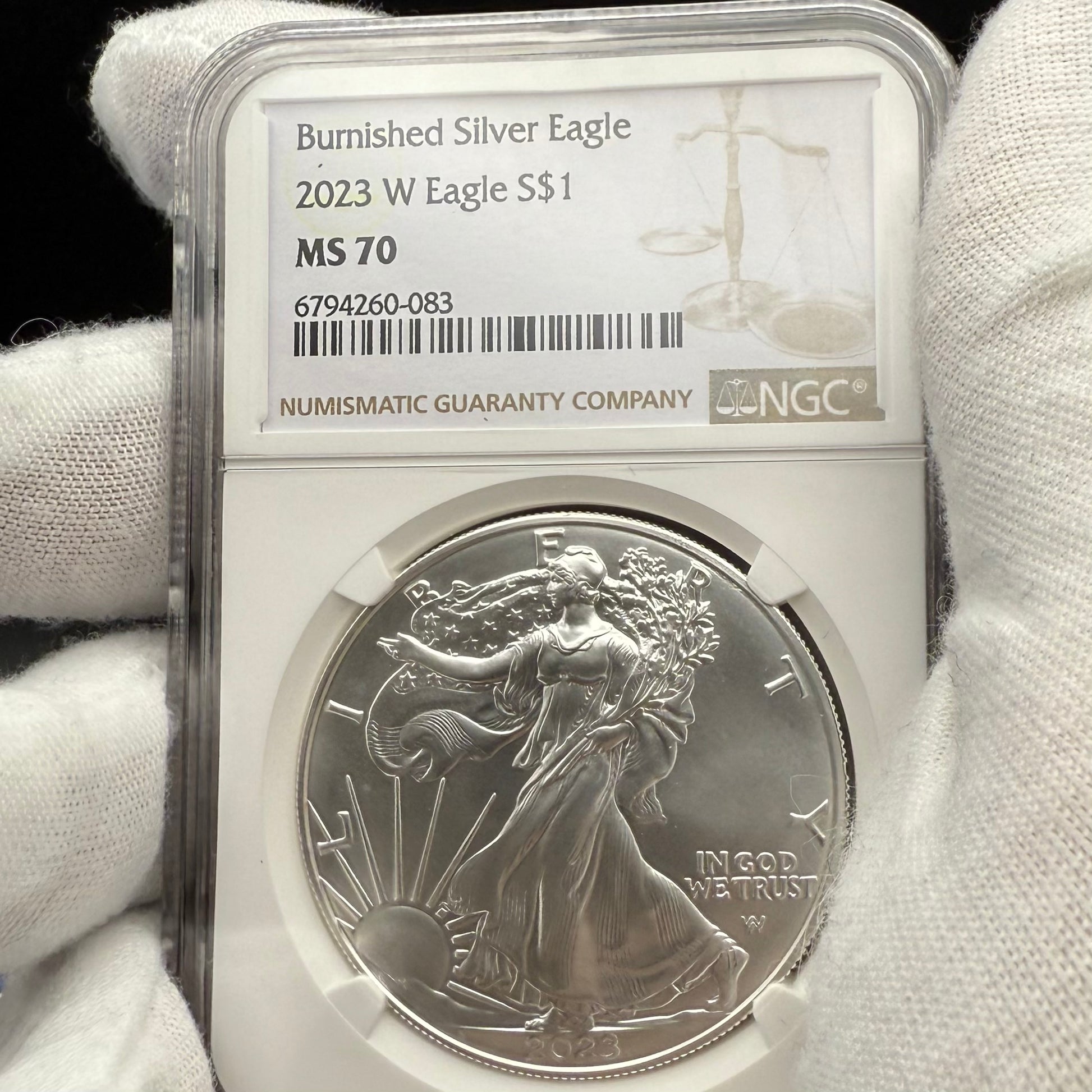 Burnished 2023 (W) $1 American Silver Eagle NCG MS70 Modern Brown Label Mint Condition (1 of 1,528)