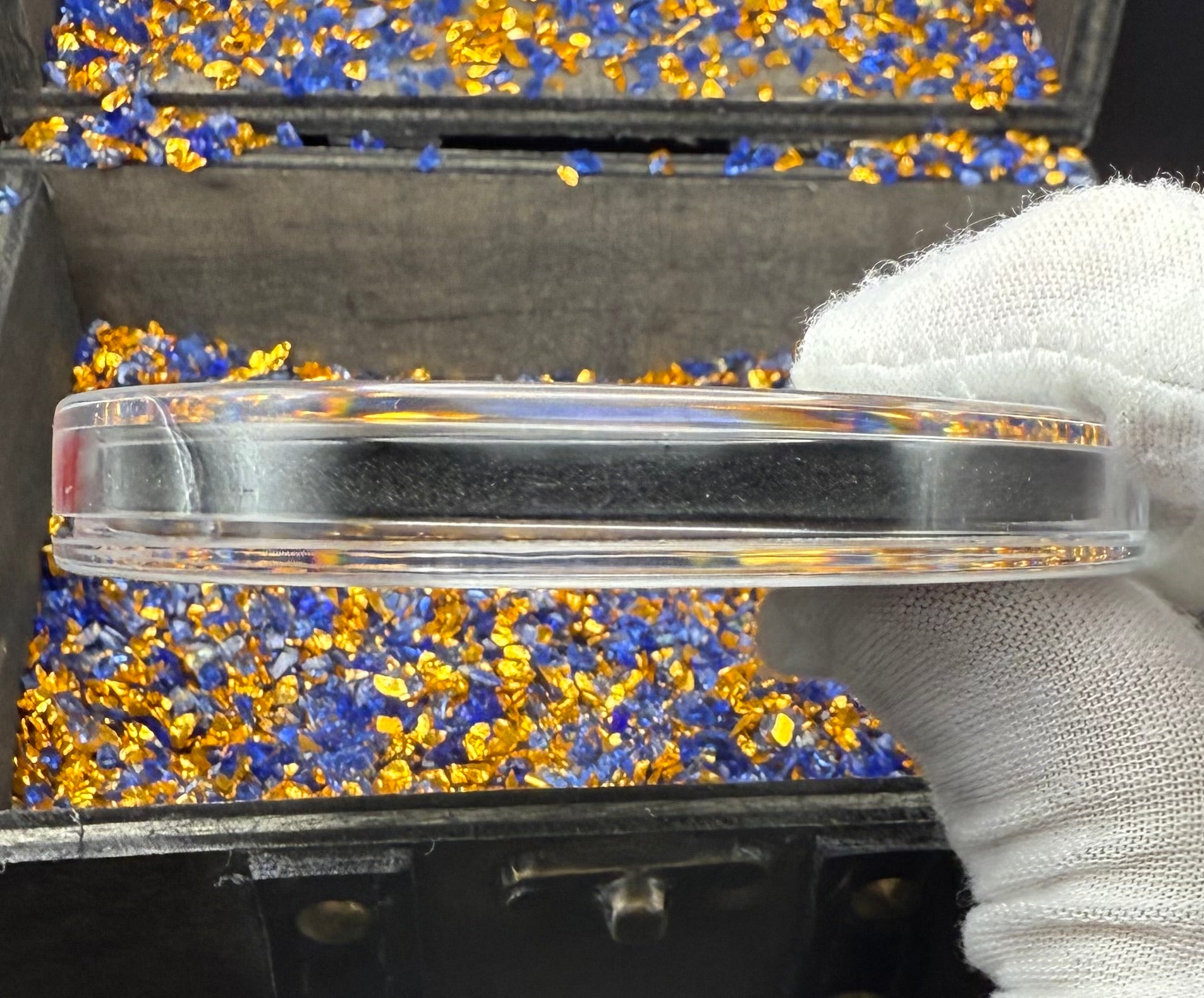 This precious piece comes sealed in a protective capsule (Acid Free / No PVC) protecting it from dust, dirt, and scratches. A custom wooden treasure chest is included to secure your valuable treasure. Signed certificate of authenticity is included.