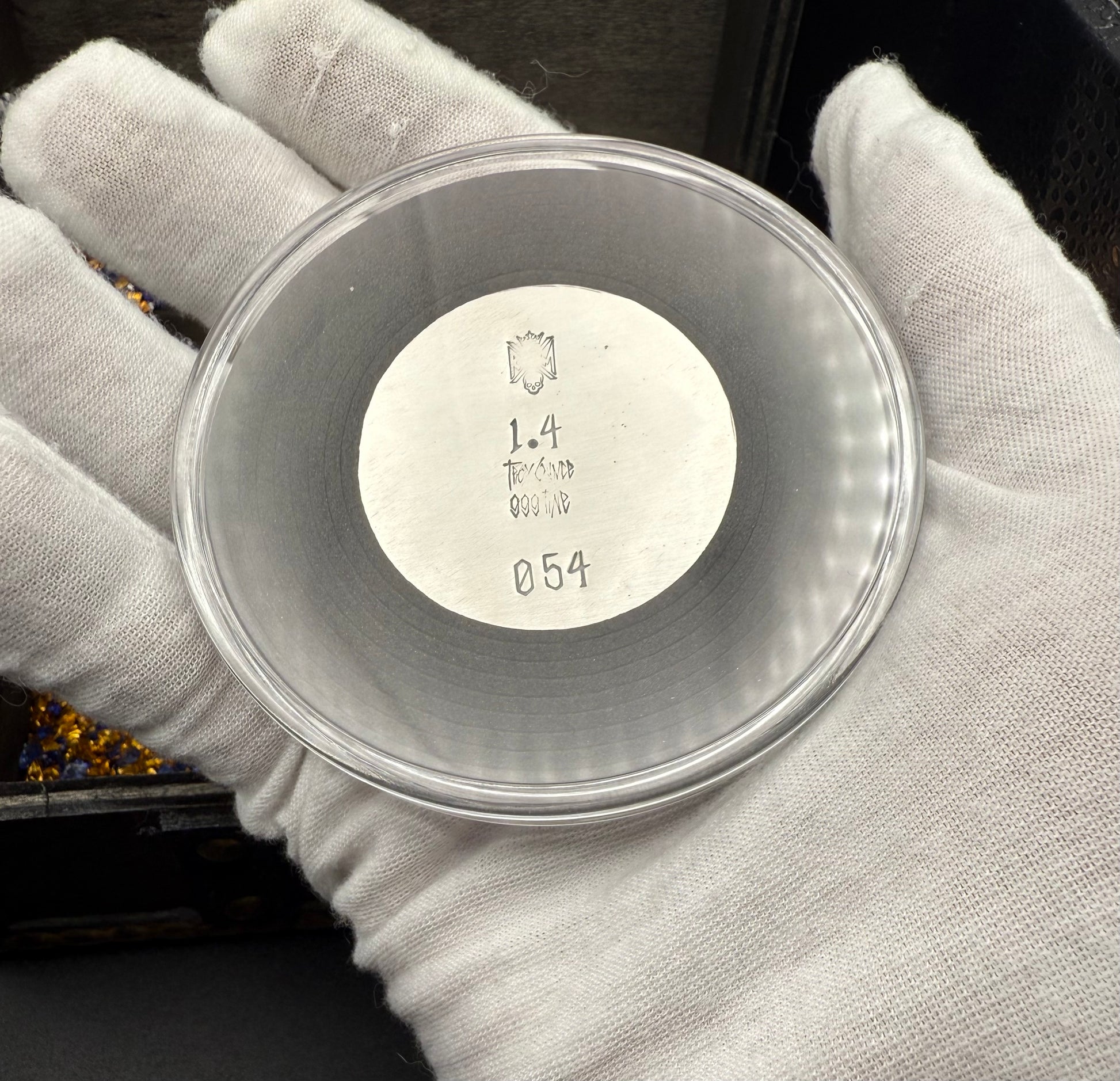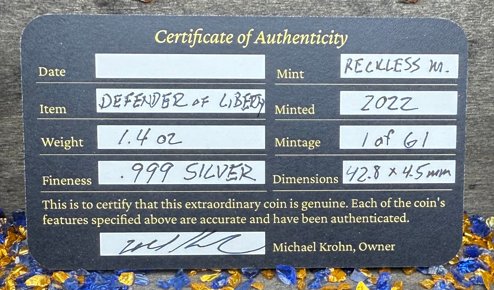 This unique limited edition piece 'Defender of Liberty' is hand crafted in 2022 by Reckless Metals using 1.4 ounces of fine silver (.999). Low mintage of 61 makes this rare piece an excellent addition to any collection. Mint condition.