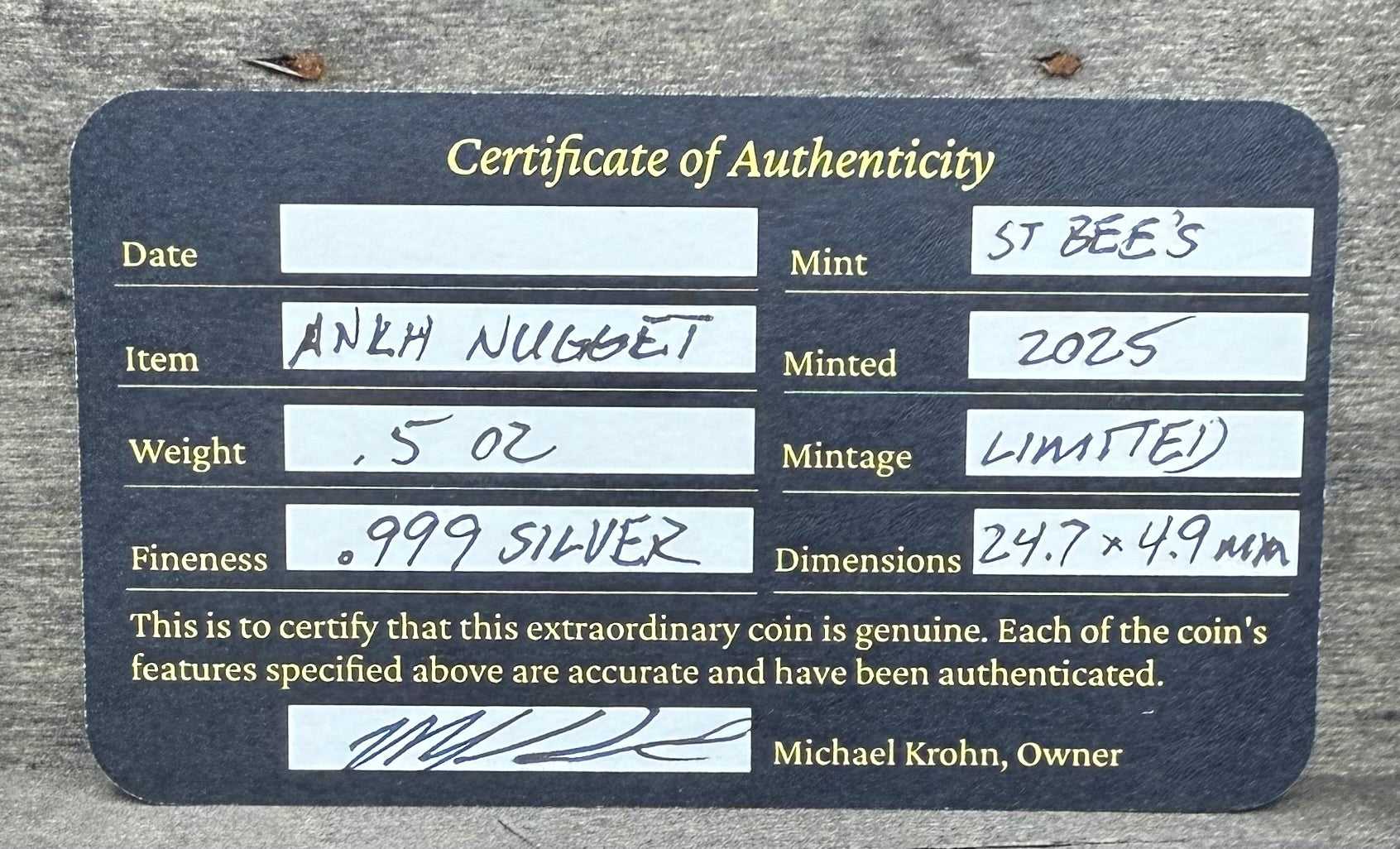 Egyptian Series 'Ankh' .5 oz .999 Pure Silver Nugget Hand Crafted by St Bee's in England, Antique Finish, Includes Wooden Box & COA, Mint Condition Limited Edition