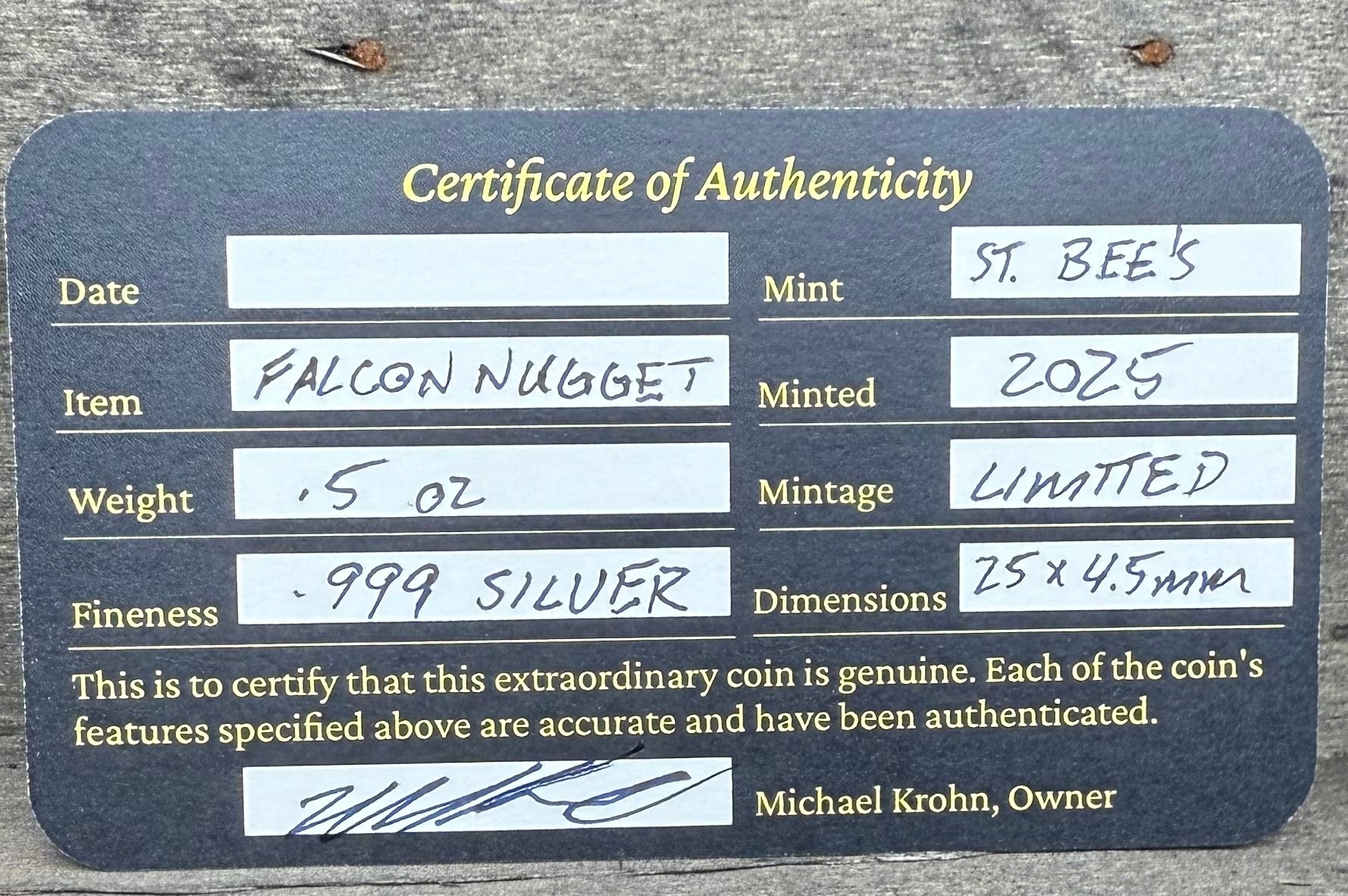 This Falcon silver nugget is hand crafted in Northern England by St Bee's Silver using .5 ounces of .999 pure silver bullion. Careful attention to detail has been taken to create a rustic and aged appearance. This beautiful limited edition sliver art is inspired by ancient Egypt and makes a fantastic addition to any portfolio.