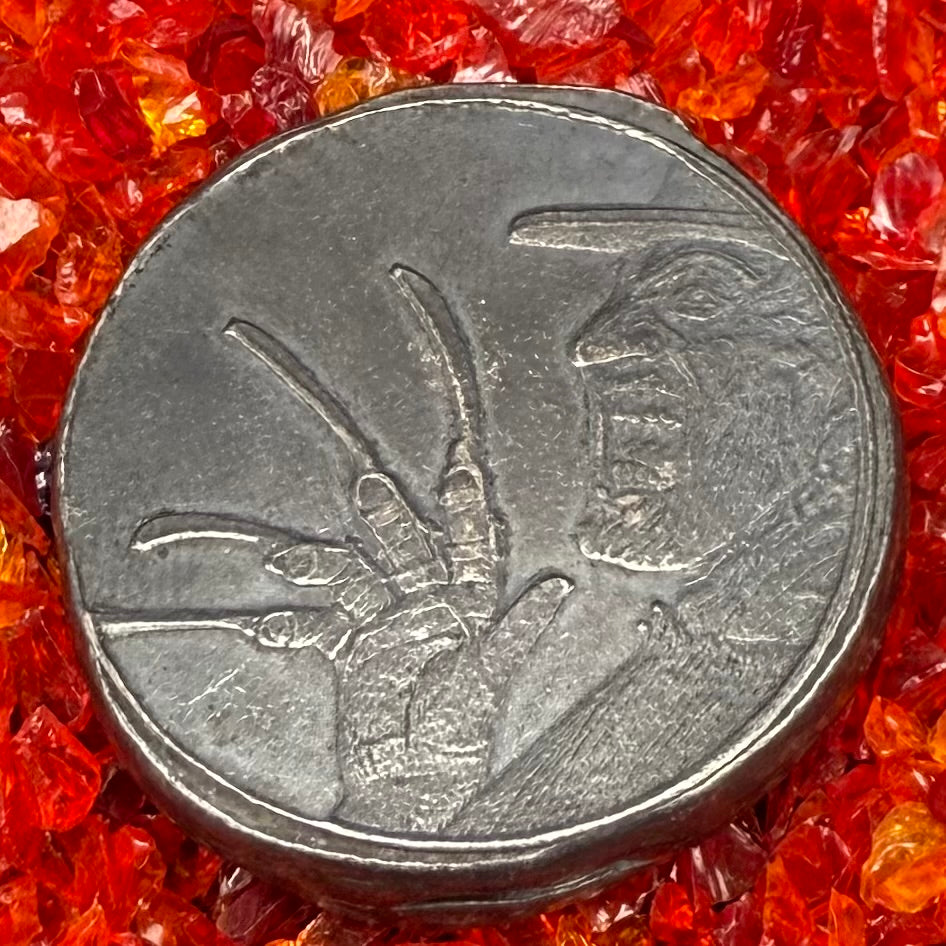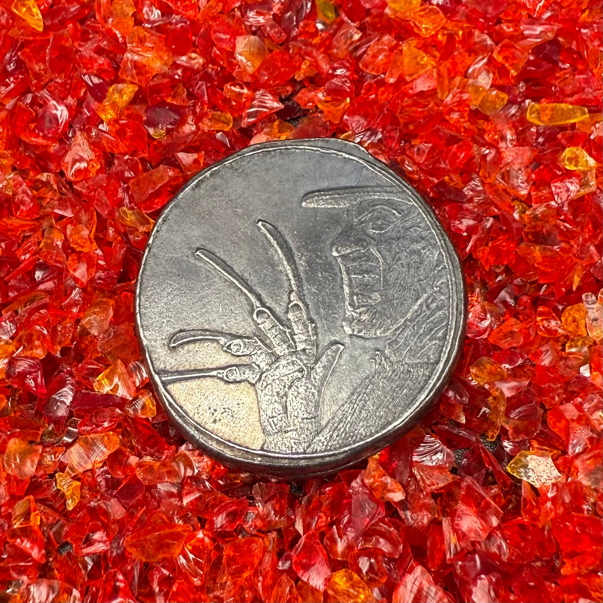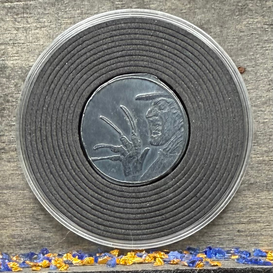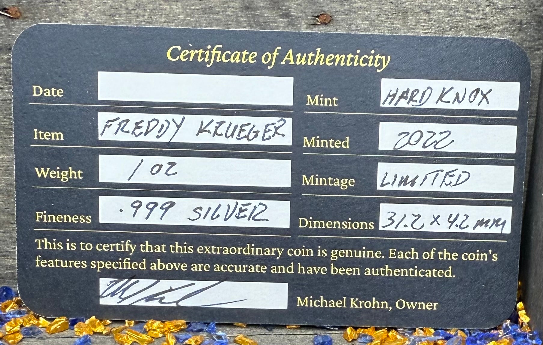This unique limited edition piece 'Freddy Krueger Sweet Dreams' is hand crafted in 2022 by Hard Knox Metals using 1 ounce of fine silver (.999). Low mintage makes this rare piece an excellent addition to any collection. Excellent condition.