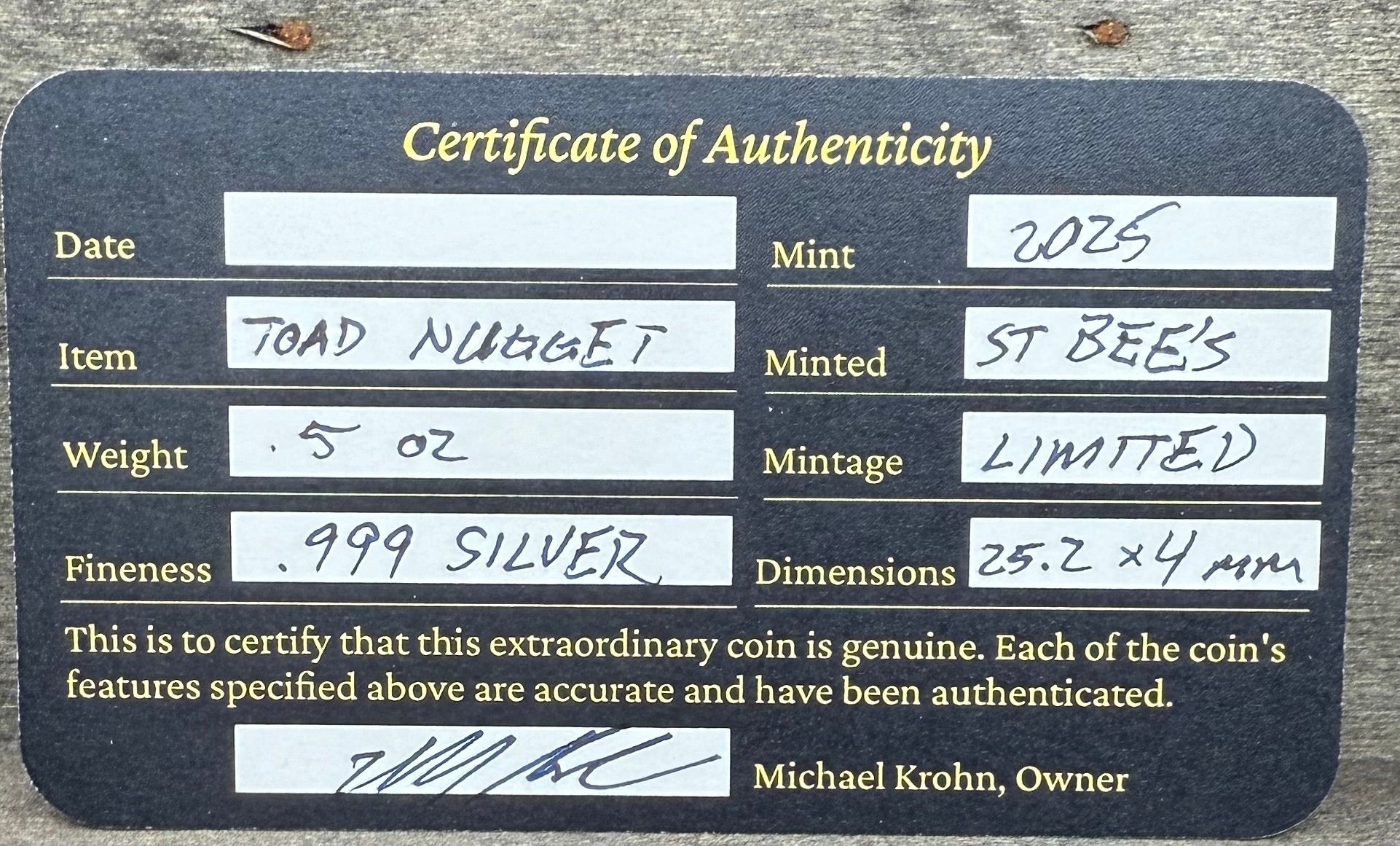 'Cute Frog' .5 oz .999 Pure Silver Nugget Hand Crafted by St Bee's in England, Shiny Finish, Includes Wooden Box & COA, Mint Condition Limited Edition