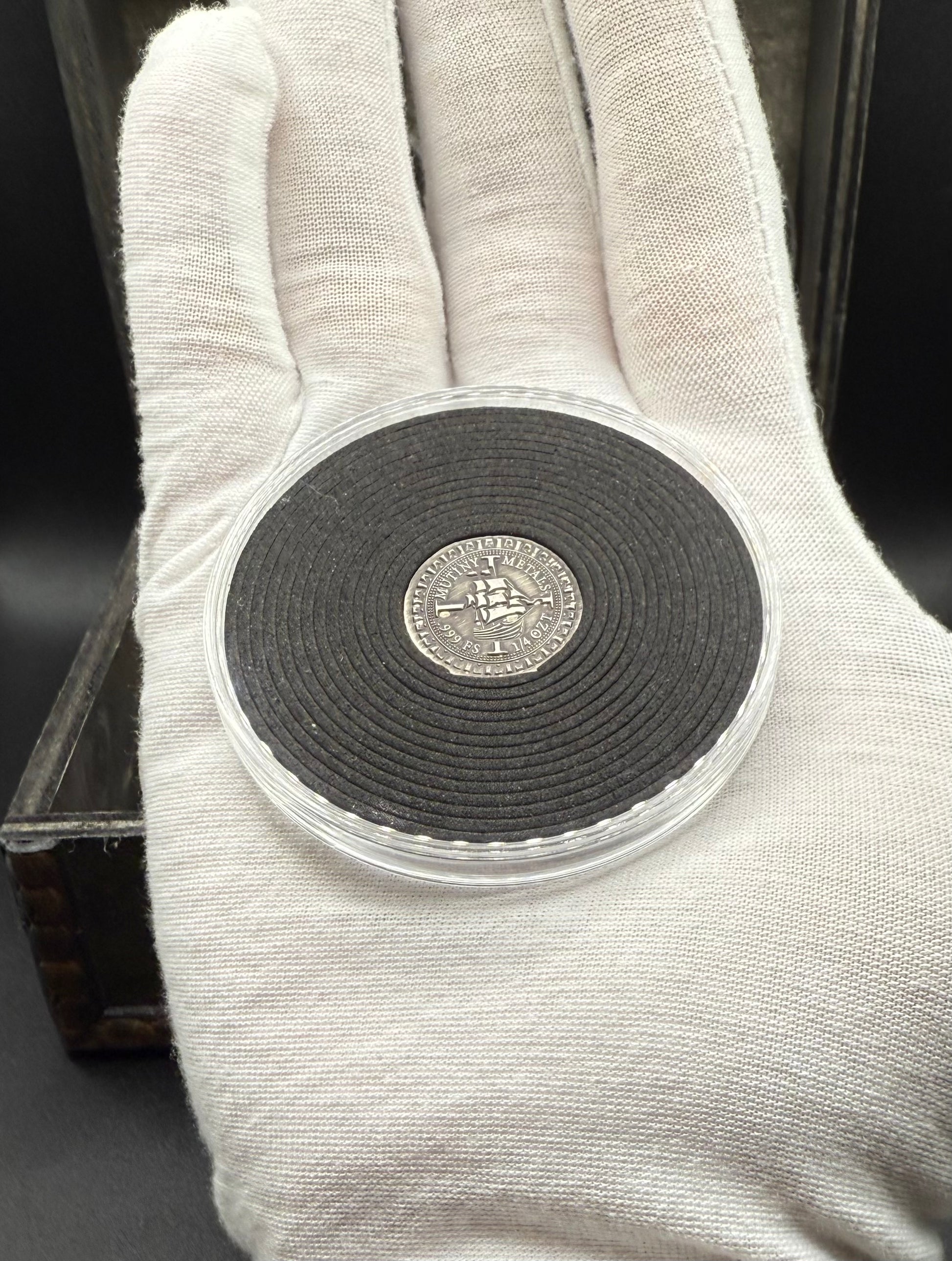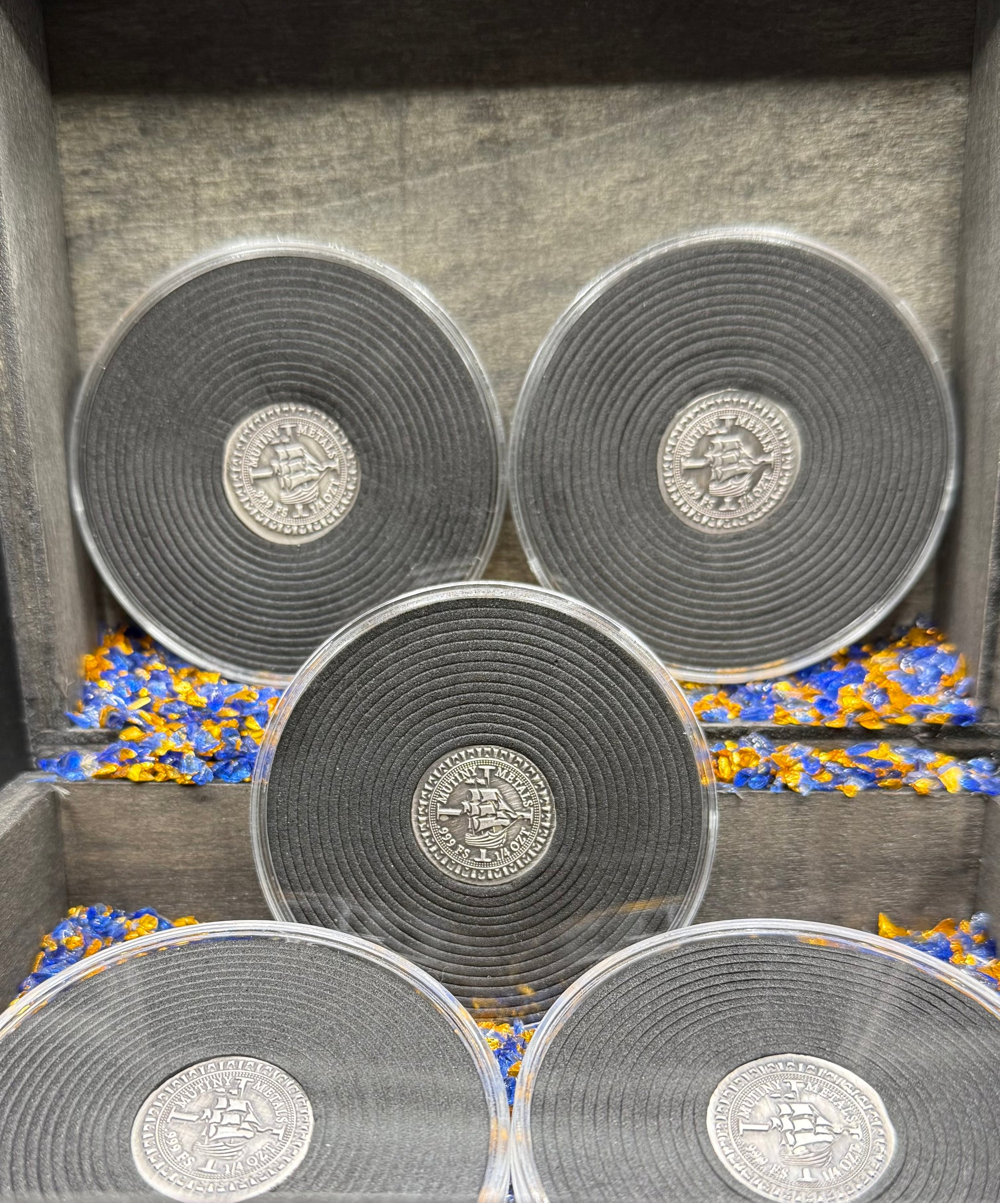 'Silver Doubloon' Pirate Treasure Hand Crafted by Mutiny Metals 1.25 Troy Ounce .999 Fine Silver Round 5 Piece Set Antique Finish Includes Wood Treasure Chest, Capsule & COA