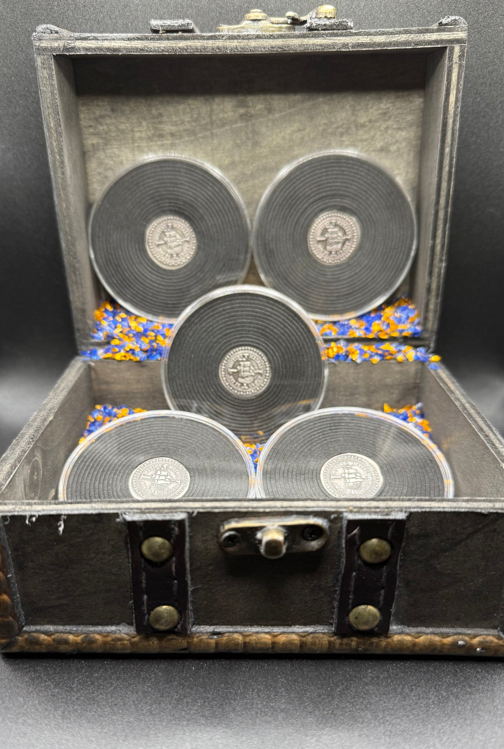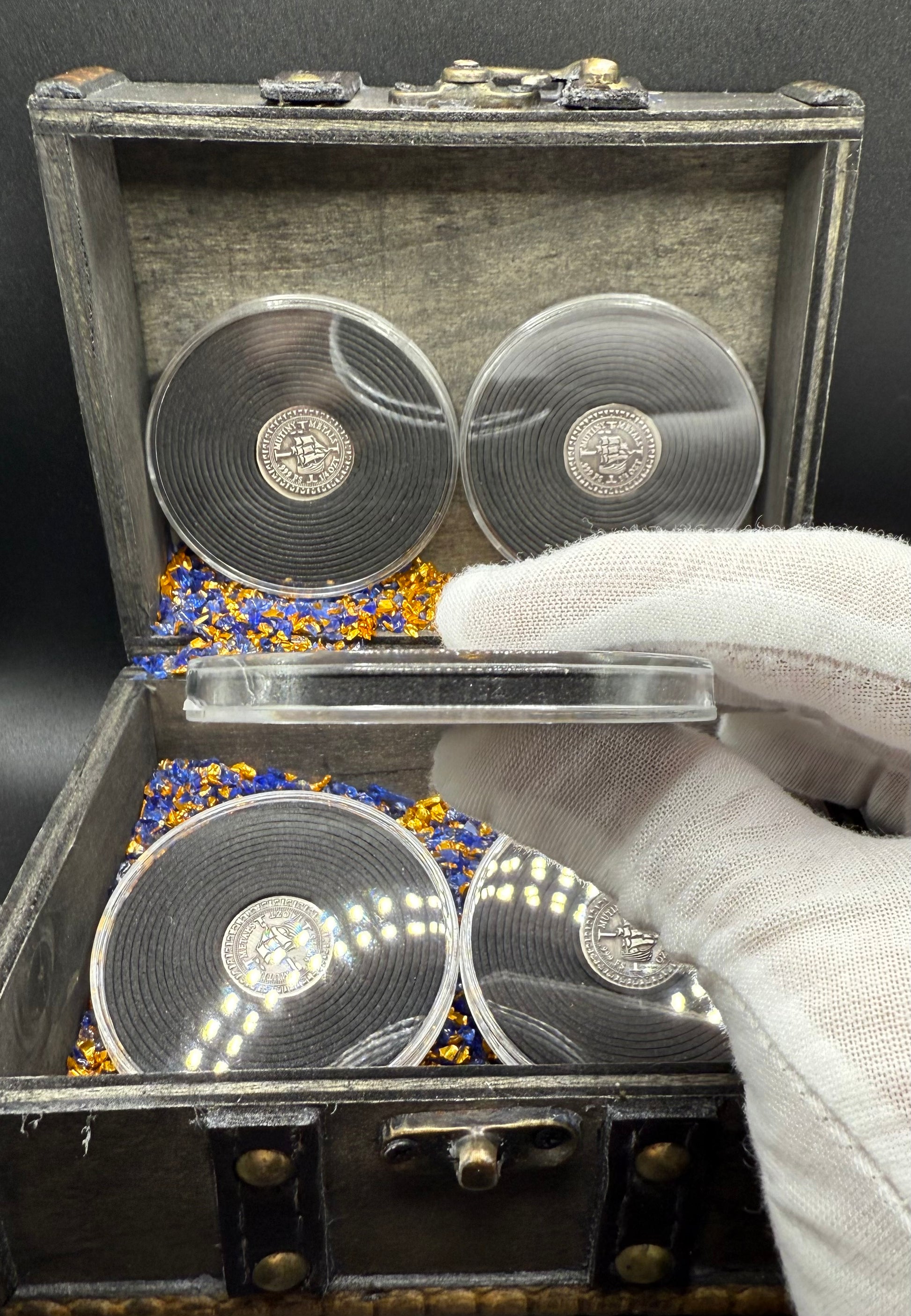 These precious pieces come sealed in a protective capsule (Acid Free / No PVC) protecting it from dust, dirt, and scratches. A custom wooden pirate treasure chest is included to secure your valuable pirate treasure. Certificate of authenticity is included.