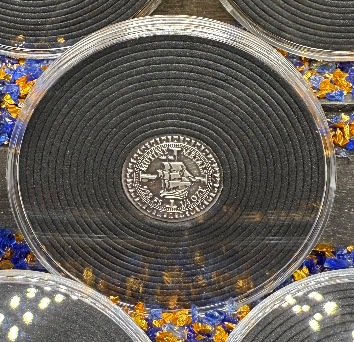 This beautiful pirate treasure set consists of five 'Silver Pirate Doubloon' hand made by Mutiny Metals. These fine silver rounds were hand crafted in 2025. Each piece weighs .25 Troy Ounces for a total of 1.25 Troy ounces. This peculiar pirate treasure is a popular choice for collectors and pirate enthusiasts.