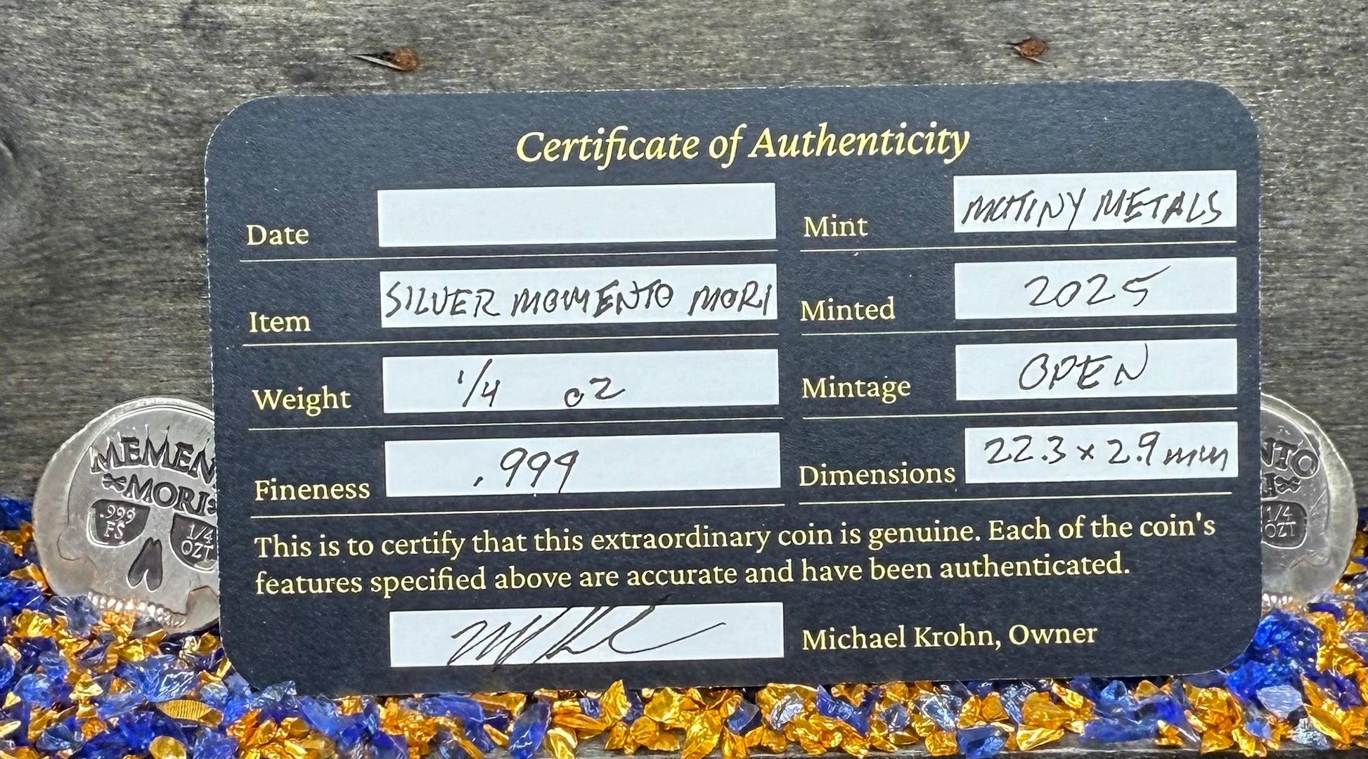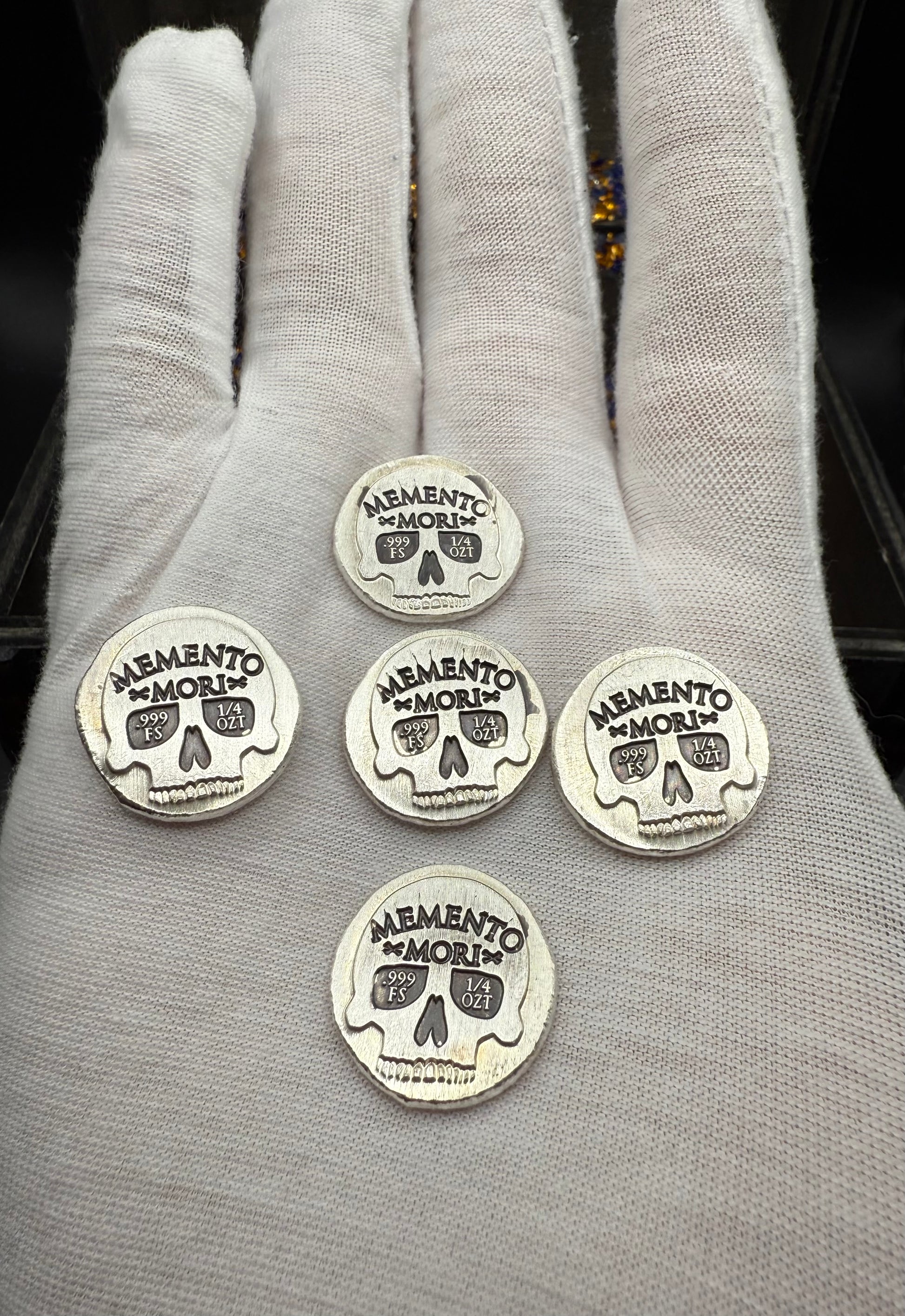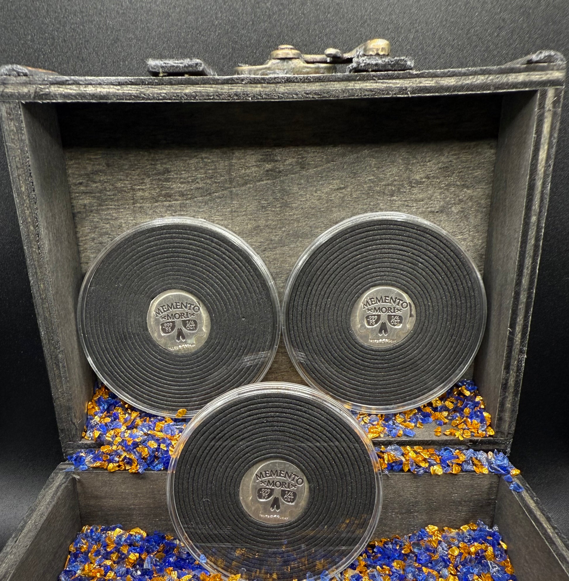 Memento Mori is Latin for 'remember that you will die' and is a symbol Pirates used to inspire fear in enemies. These fine silver rounds were hand crafted in 2025. Each piece weighs .25 Troy Ounces for a total of 1.25 Troy ounces. This peculiar pirate treasure set is a popular choice for collectors and pirate enthusiasts.