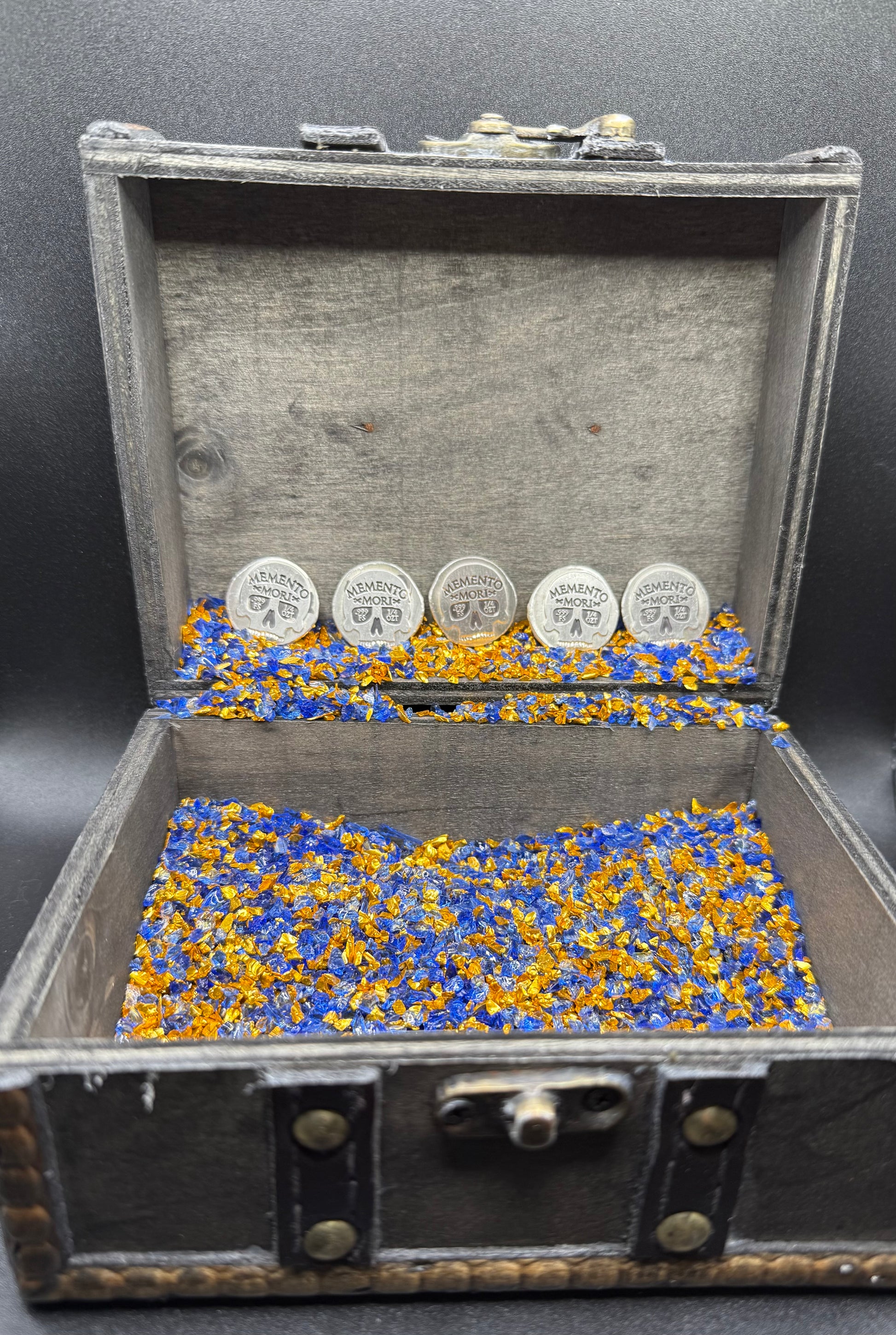 'Memento Mori' Pirate Treasure Hand Crafted by Mutiny Metals 1.25 Troy Ounce .999 Fine Silver Round 5 Piece Set Antique Finish Includes Wood Treasure Chest, Capsule & COA
