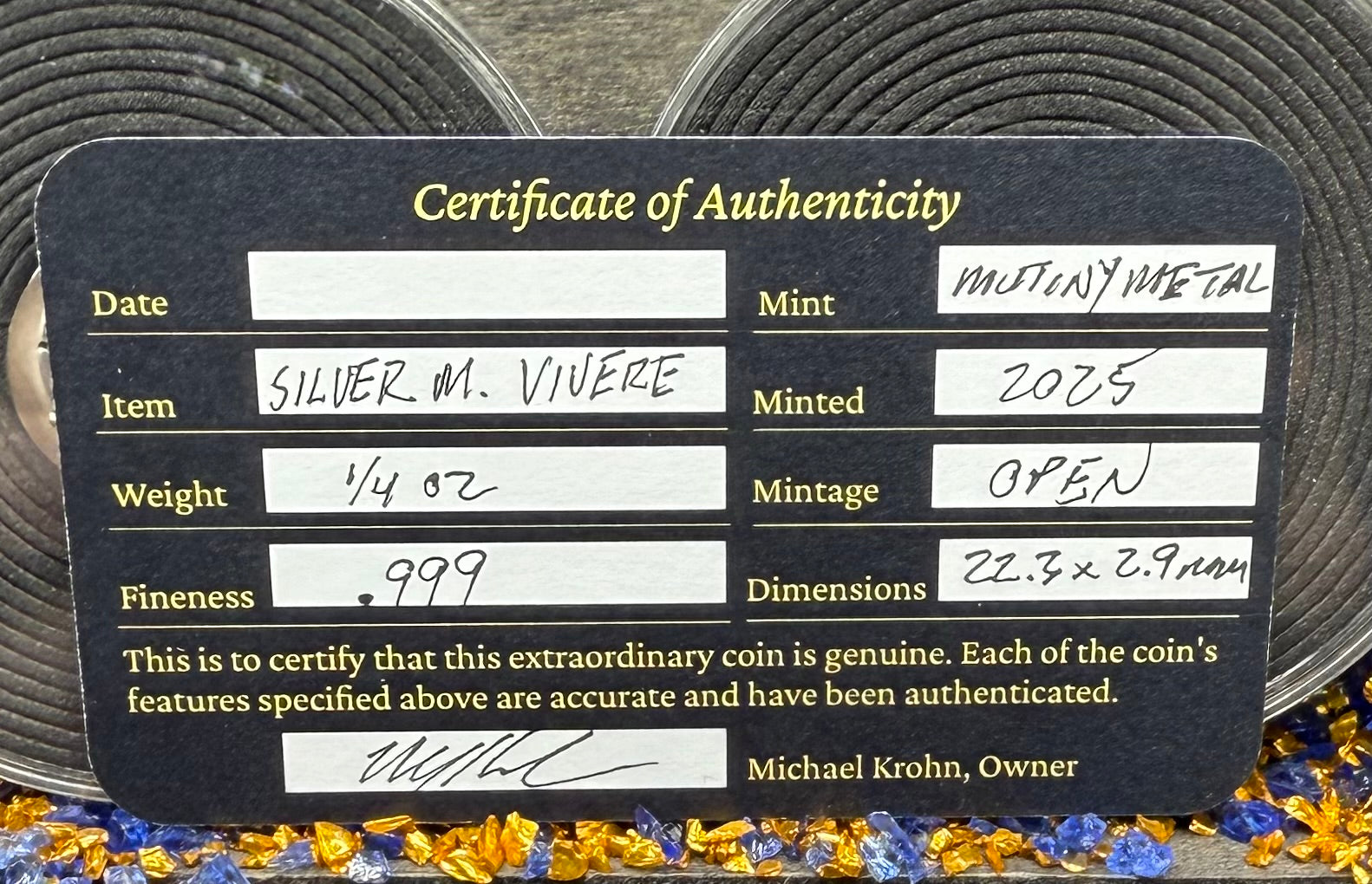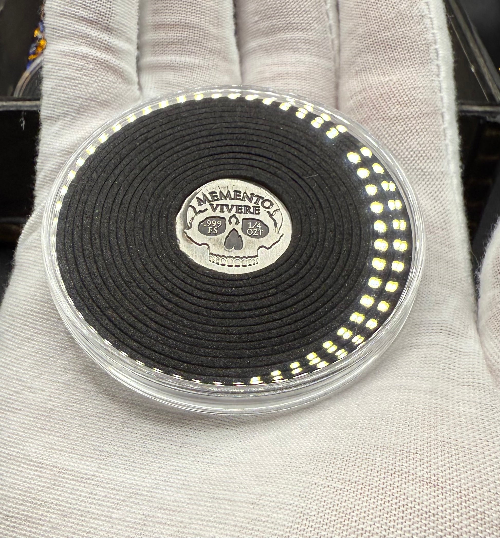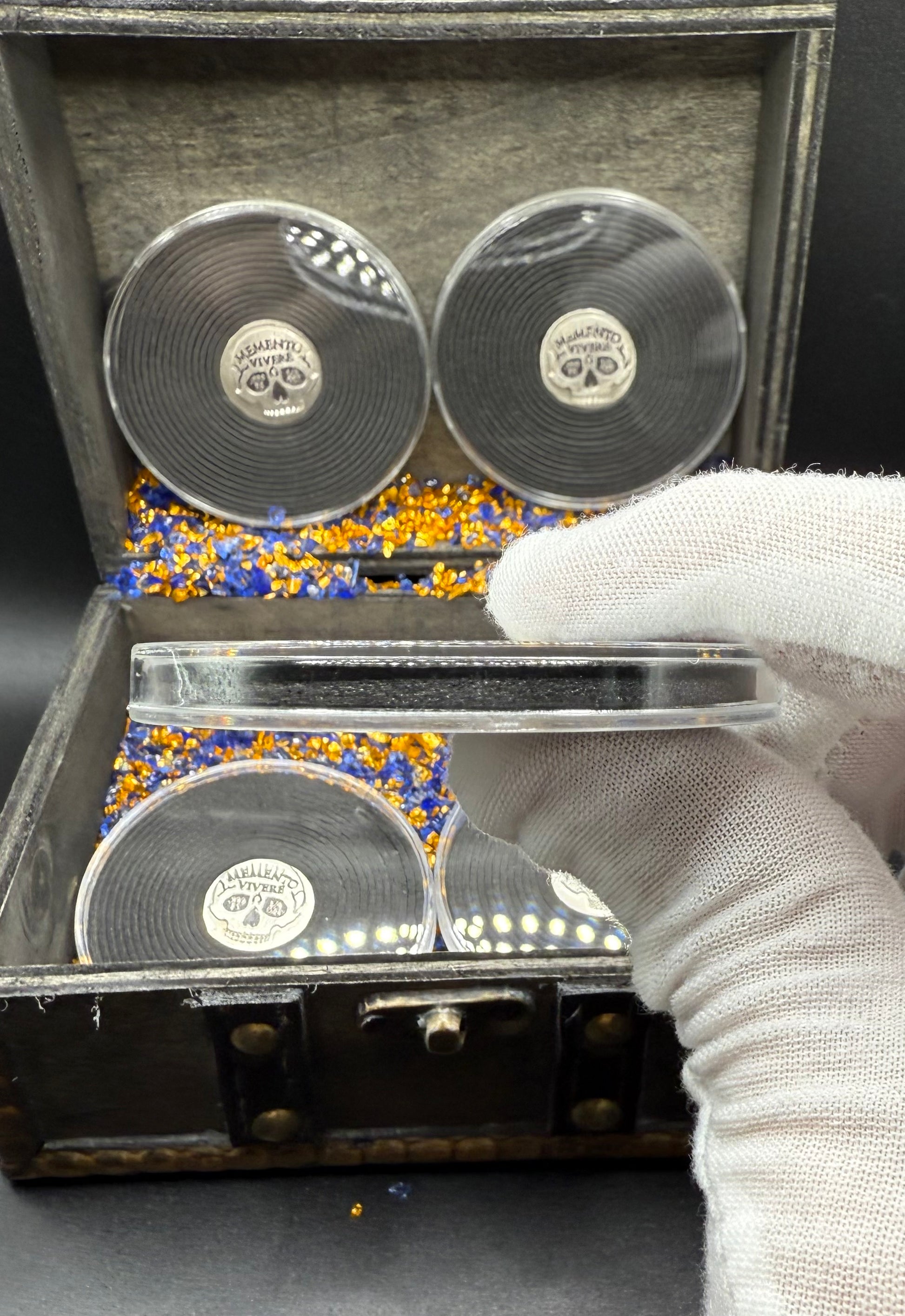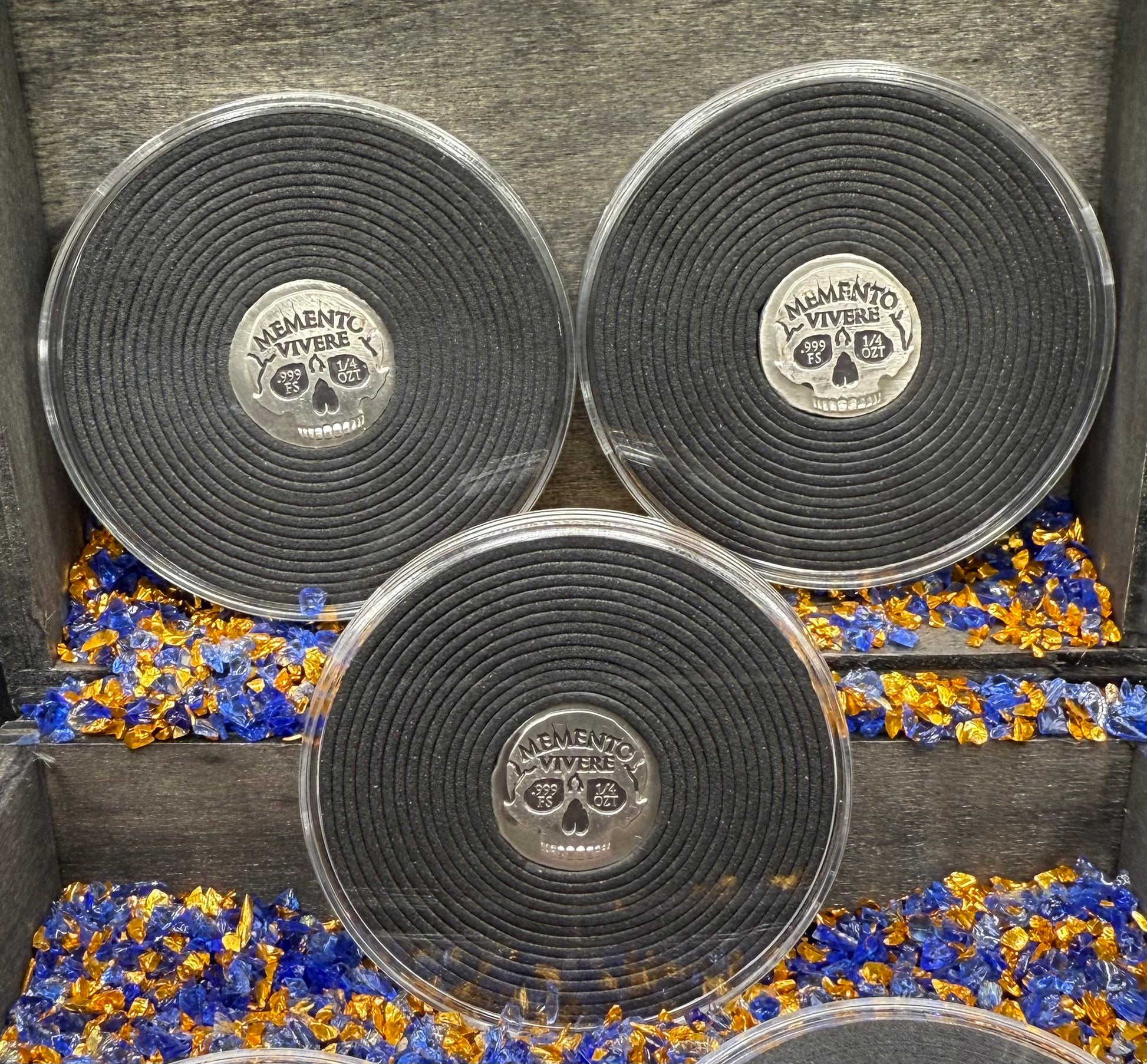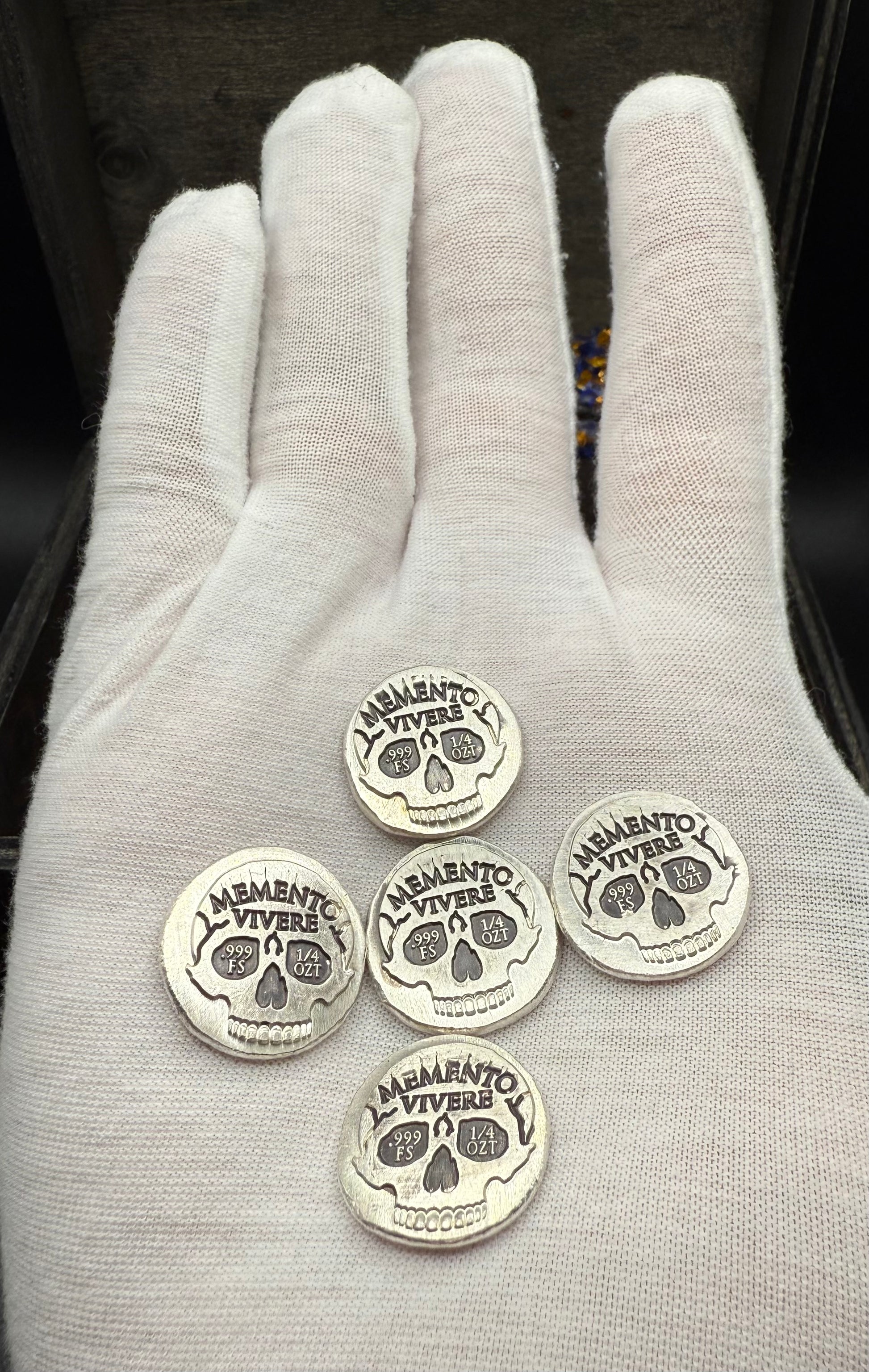 Memento Vivere is Latin for 'remember to live' and is a symbol Pirates used to inspire living an incredible life and making every moment count. These fine silver rounds are hand crafted in 2025. Each piece weighs .25 Troy Ounce for a total of 1.25 Troy ounces. This peculiar pirate treasure set is a popular choice for collectors and pirate enthusiasts.