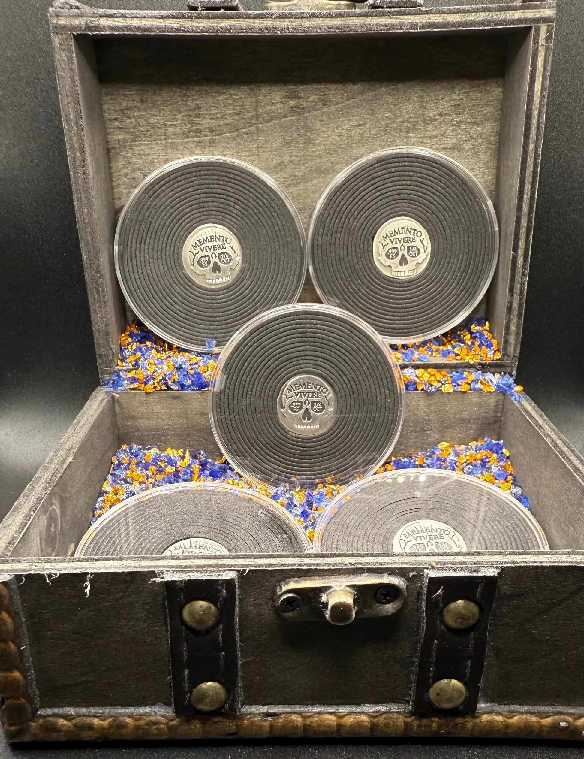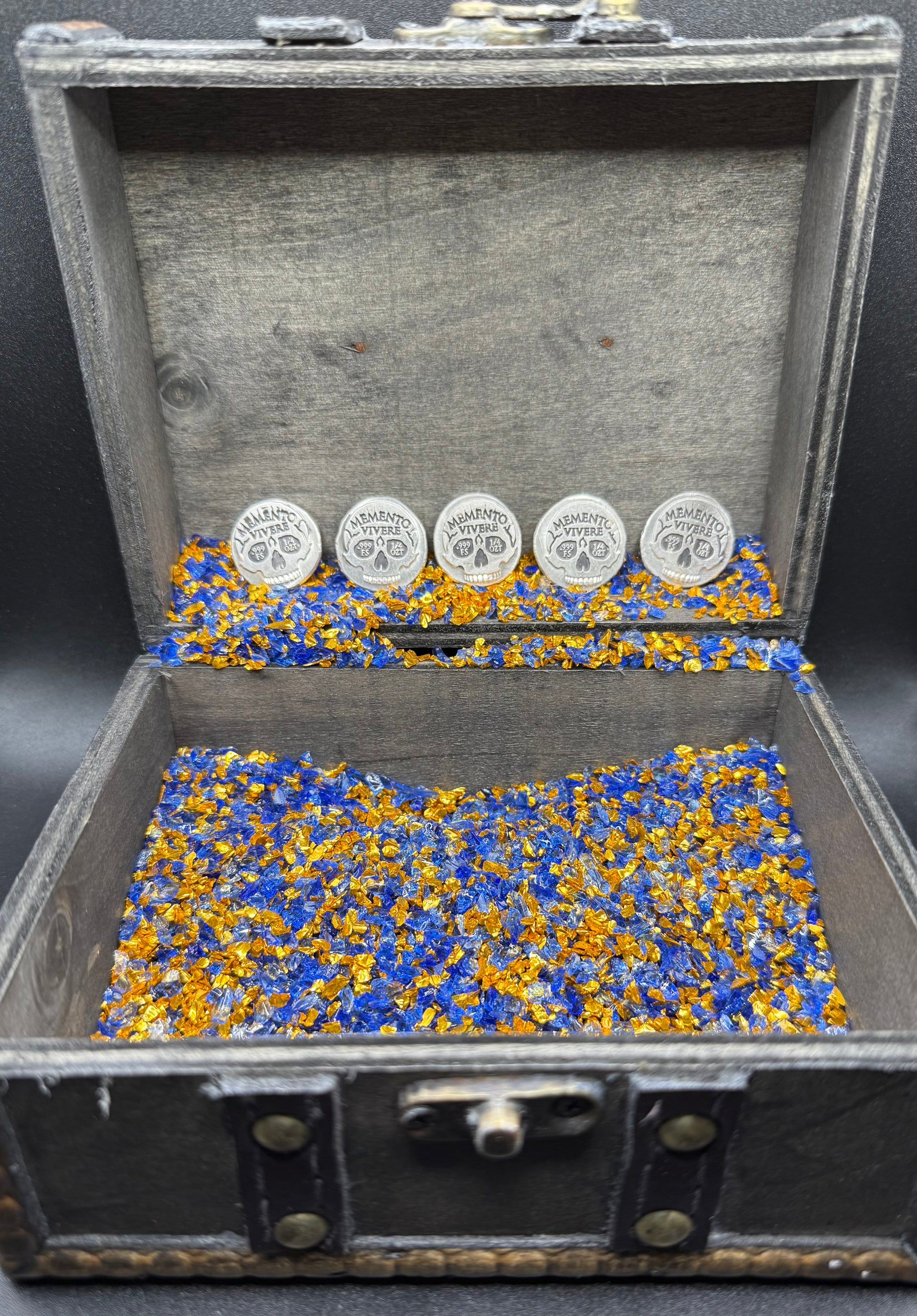 'Memento Vivere' Pirate Treasure by Mutiny Metals 1.25 Troy Ounce .999 Fine Silver Round 5 Piece Set Antique Finish Includes Wood Treasure Chest, Capsule & COA