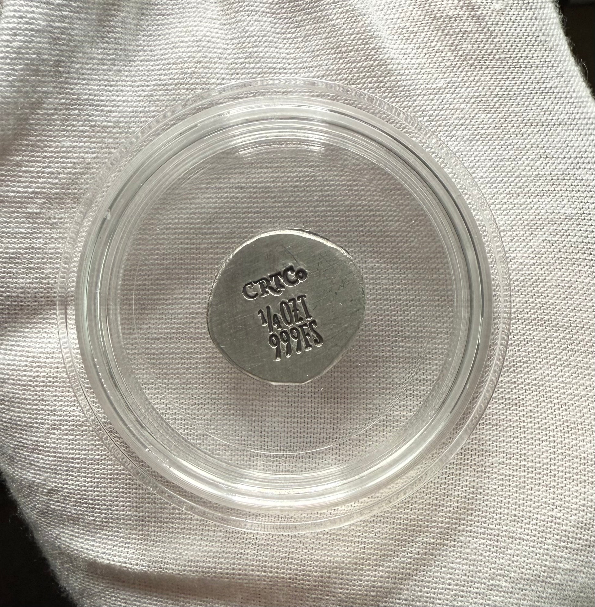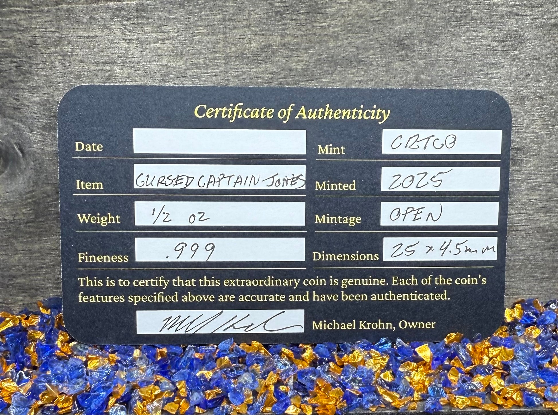 This beautiful pirate treasure set consists of three 'Cursed Captain Jones' rounds presented by Peculiar Coins. These rounds feature Fishface crafted using pure silver (.999). The first piece weighs 1 troy ounce (29.2 mm x 5.7 mm), the second piece weights 1/2 troy ounce (25 mm x 4.5 mm) and the third piece weighs 1/4 troy ounce (20 mm x 3.5 mm) for a total of 1.75 ounces. This peculiar pirate treasure was minted in 2025 and is a popular choice for collectors and pirate enthusiasts.