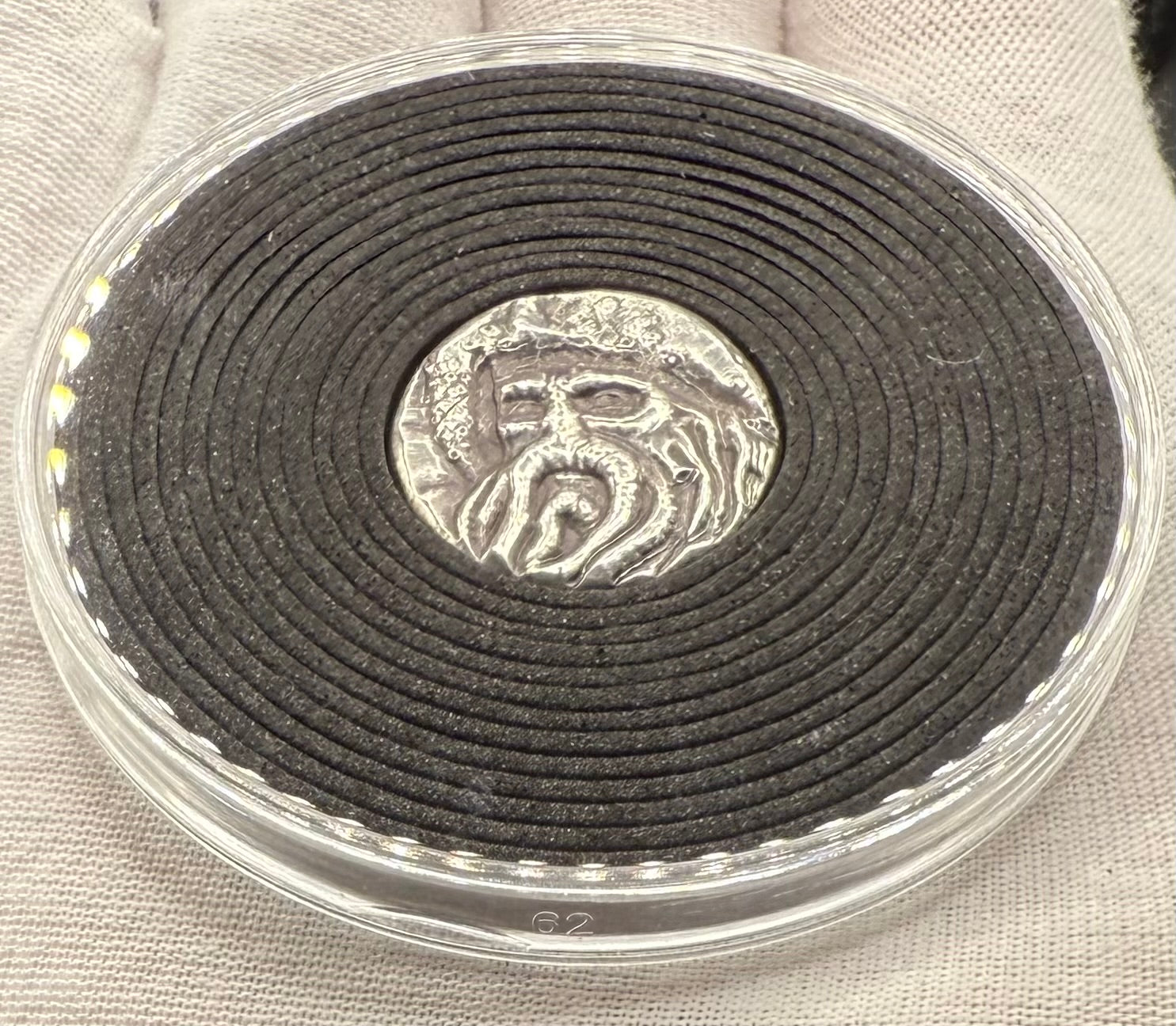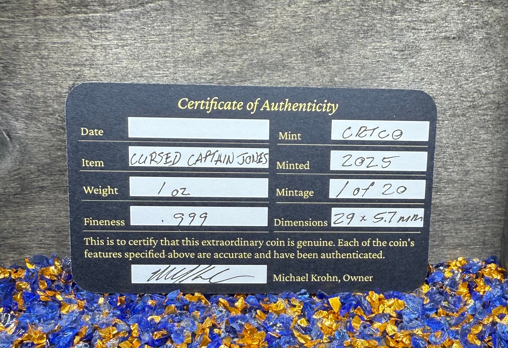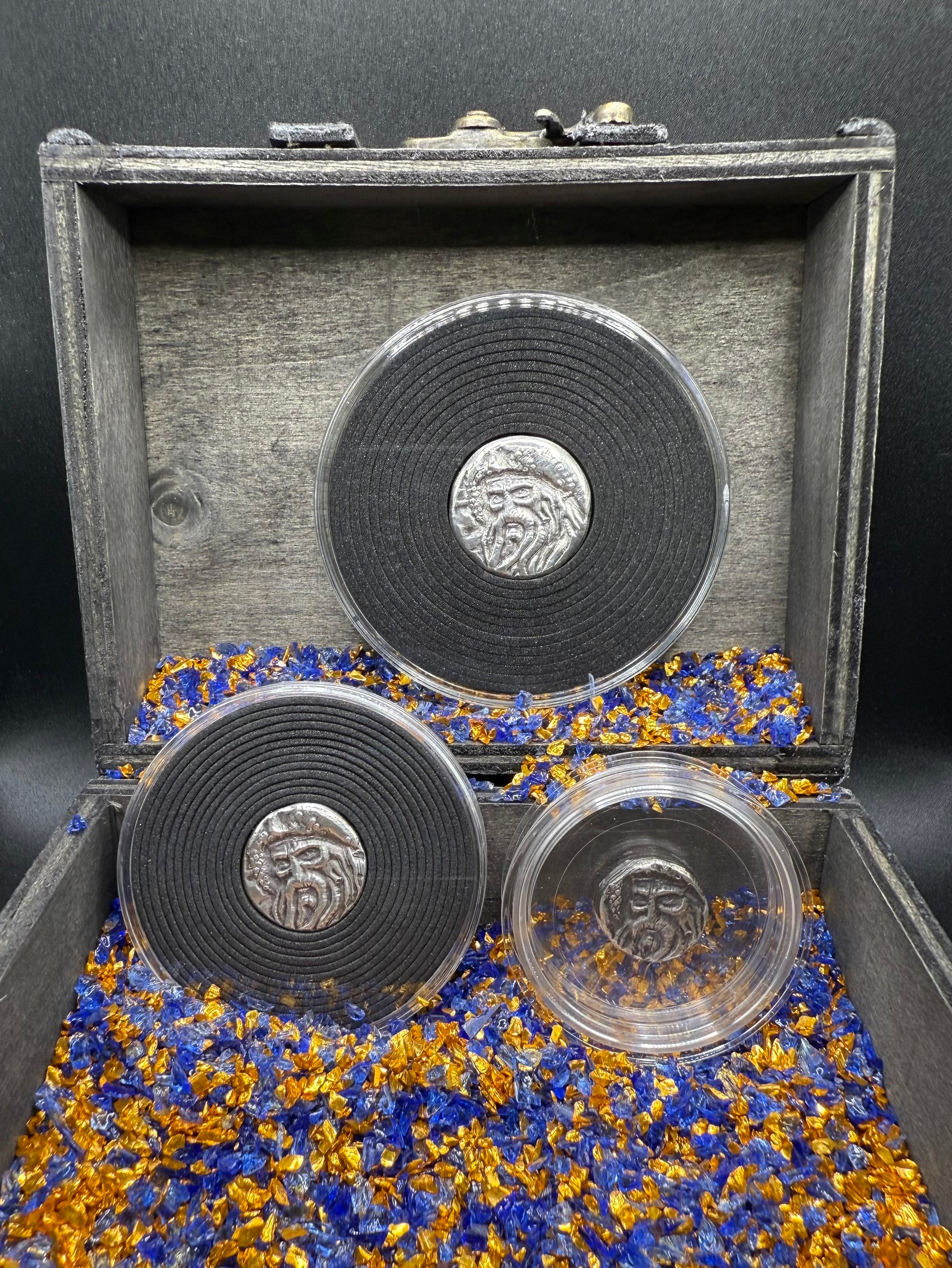 'Fishface Cursed Pirate Captain Jones' Hand Crafted 1.75 Troy Ounce .999 Fine Silver Round 3 Piece Set Antique Finish Includes Wood Treasure Chest, Capsule & COA Mint Condition Limited Edition 1 of 20