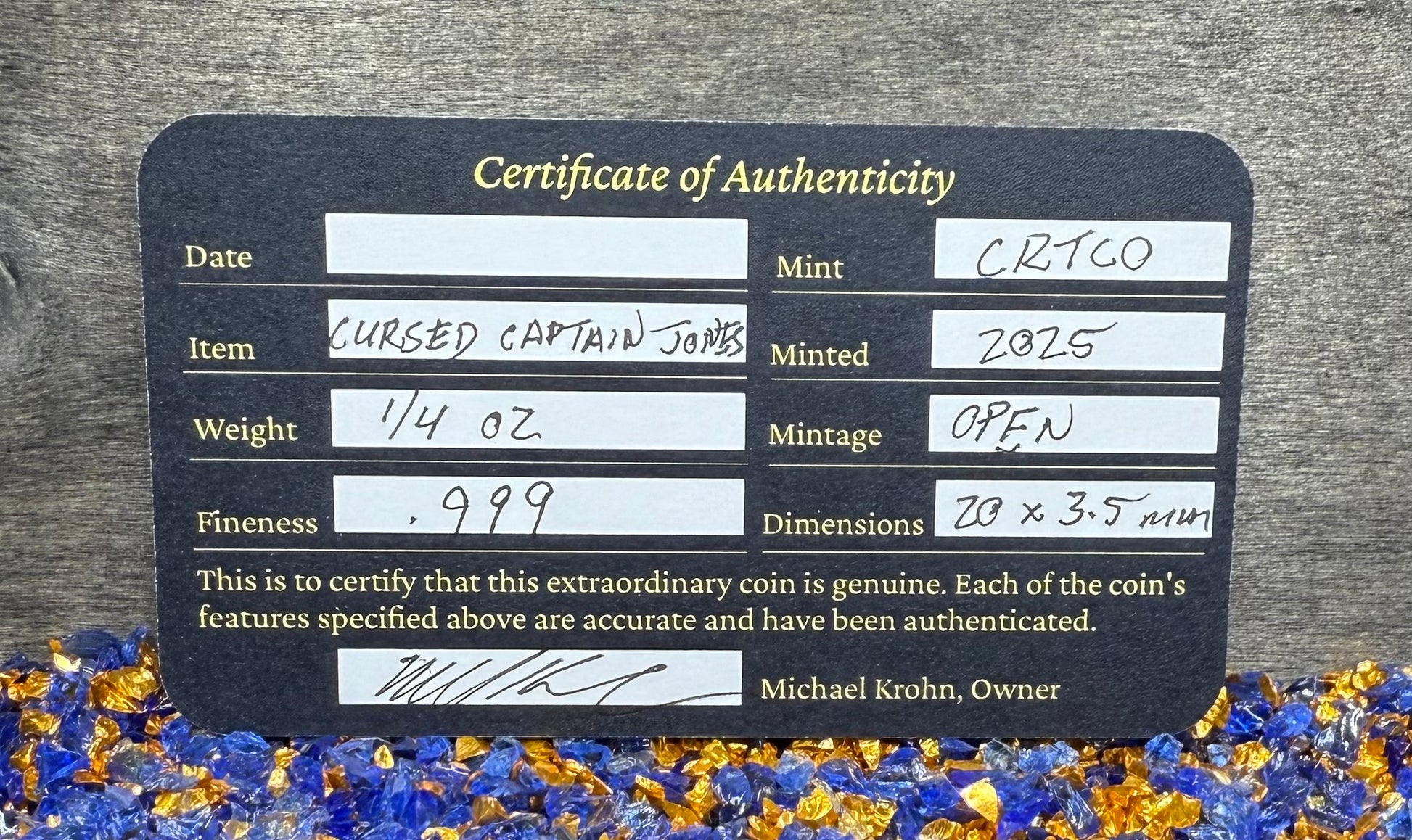 These precious pieces come sealed in a protective capsule (Acid Free / No PVC) protecting it from dust, dirt, and scratches. A custom wooden pirate treasure chest is included to secure your valuable pirate treasure. Certificate of authenticity is included.