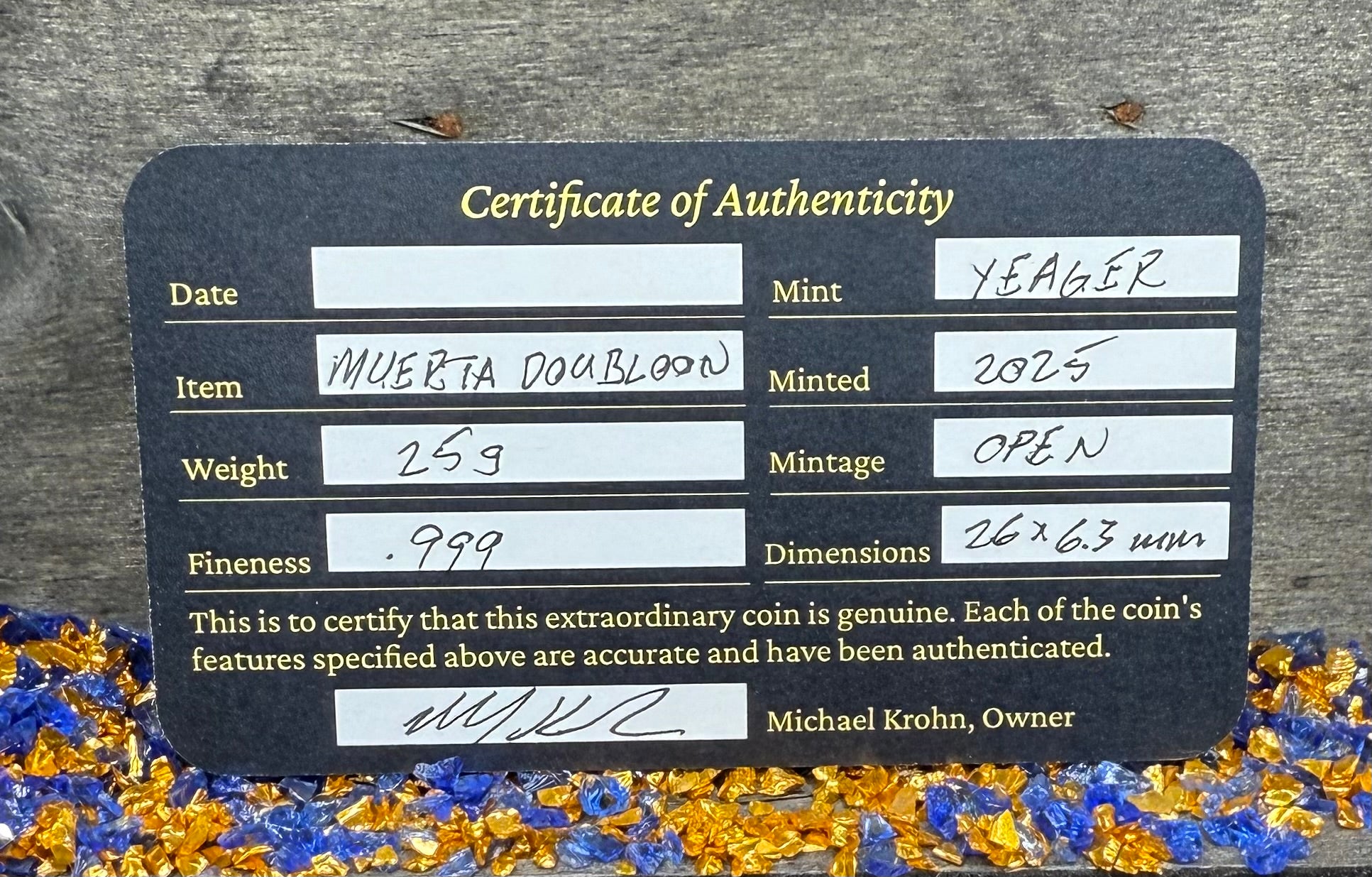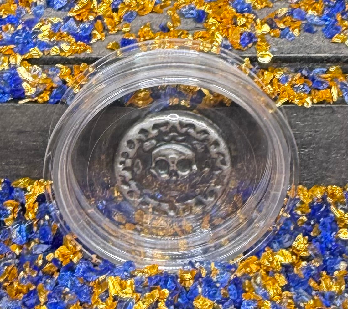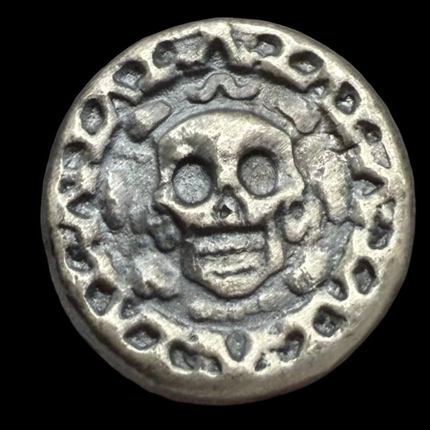 This beautiful silver pirate treasure 'Muerta Doubloon' hand crafted by Yeager Mint in 2025 using 25 grams of fine silver .999 features a peculiar skull design.