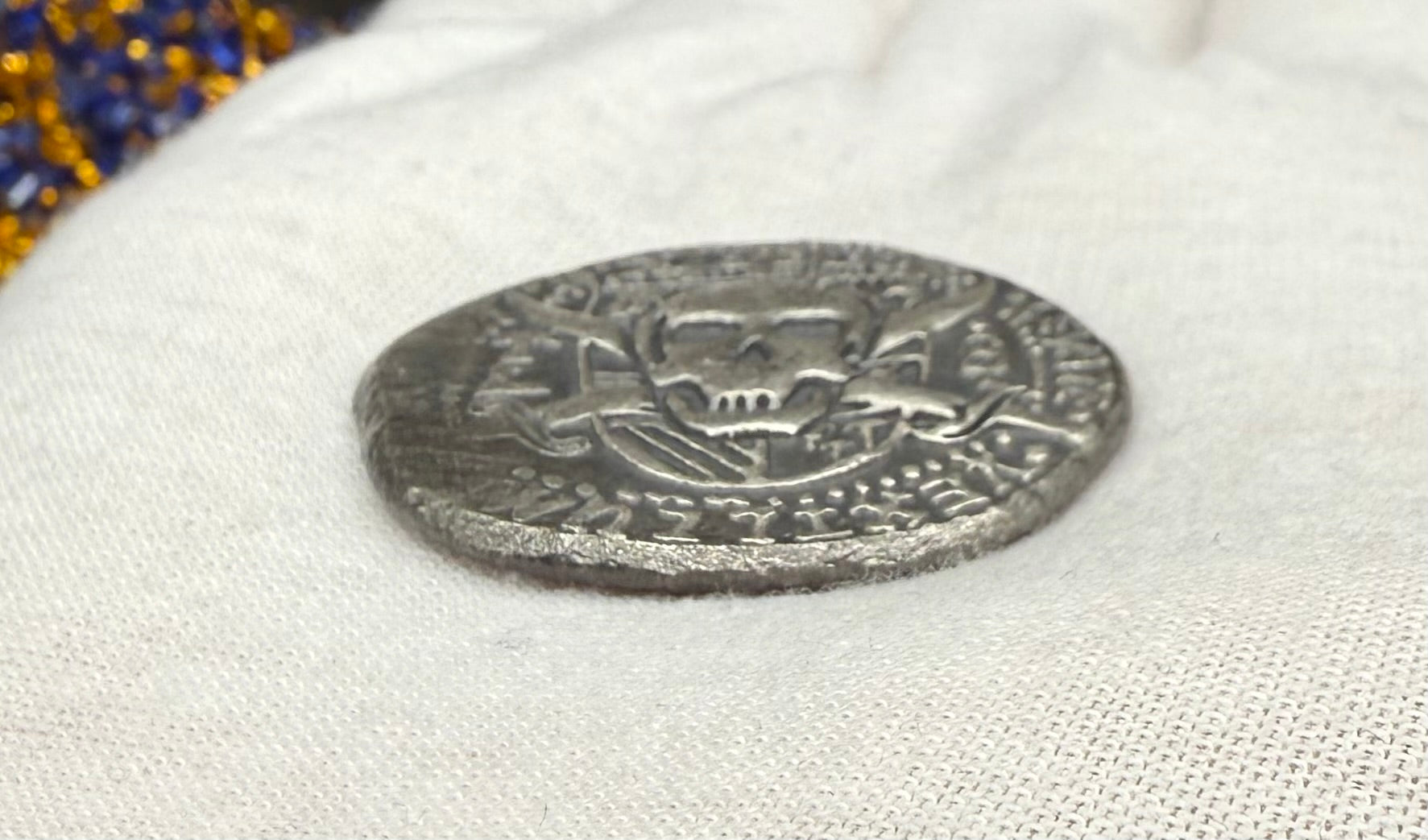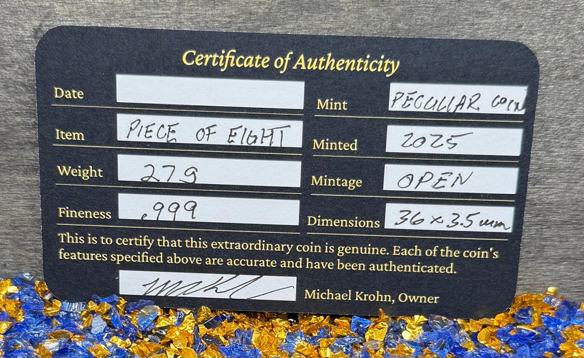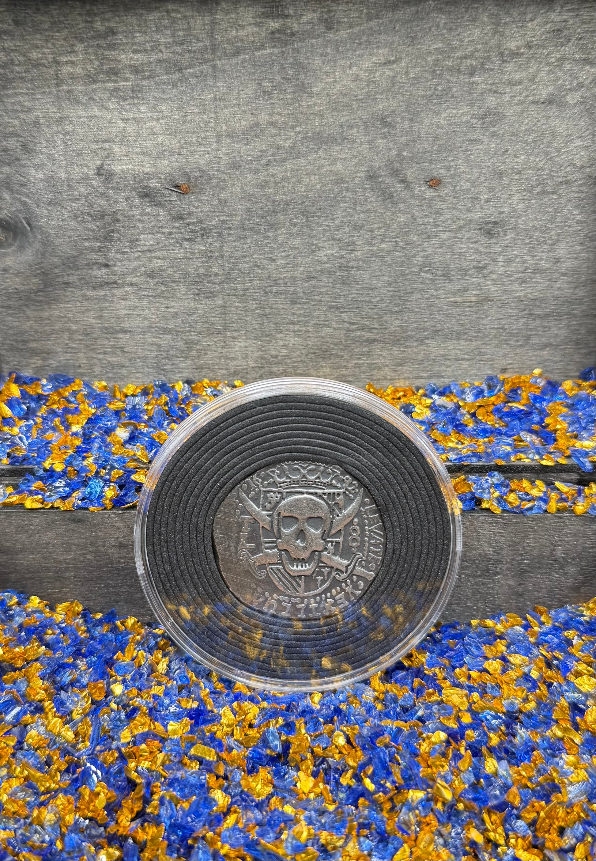 This piece was minted in 2025 by Peculiar Coins using 27 grams of fine silver. This rare piece comes in an antique finish with an aged and worn appearance at the edges and throughout. No two pieces are the same because the hand crafting process on the anvil results in a different shape and amount of dye that shows up on each silver piece. This peculiar pirate treasure is a popular choice for collectors and pirate enthusiasts.