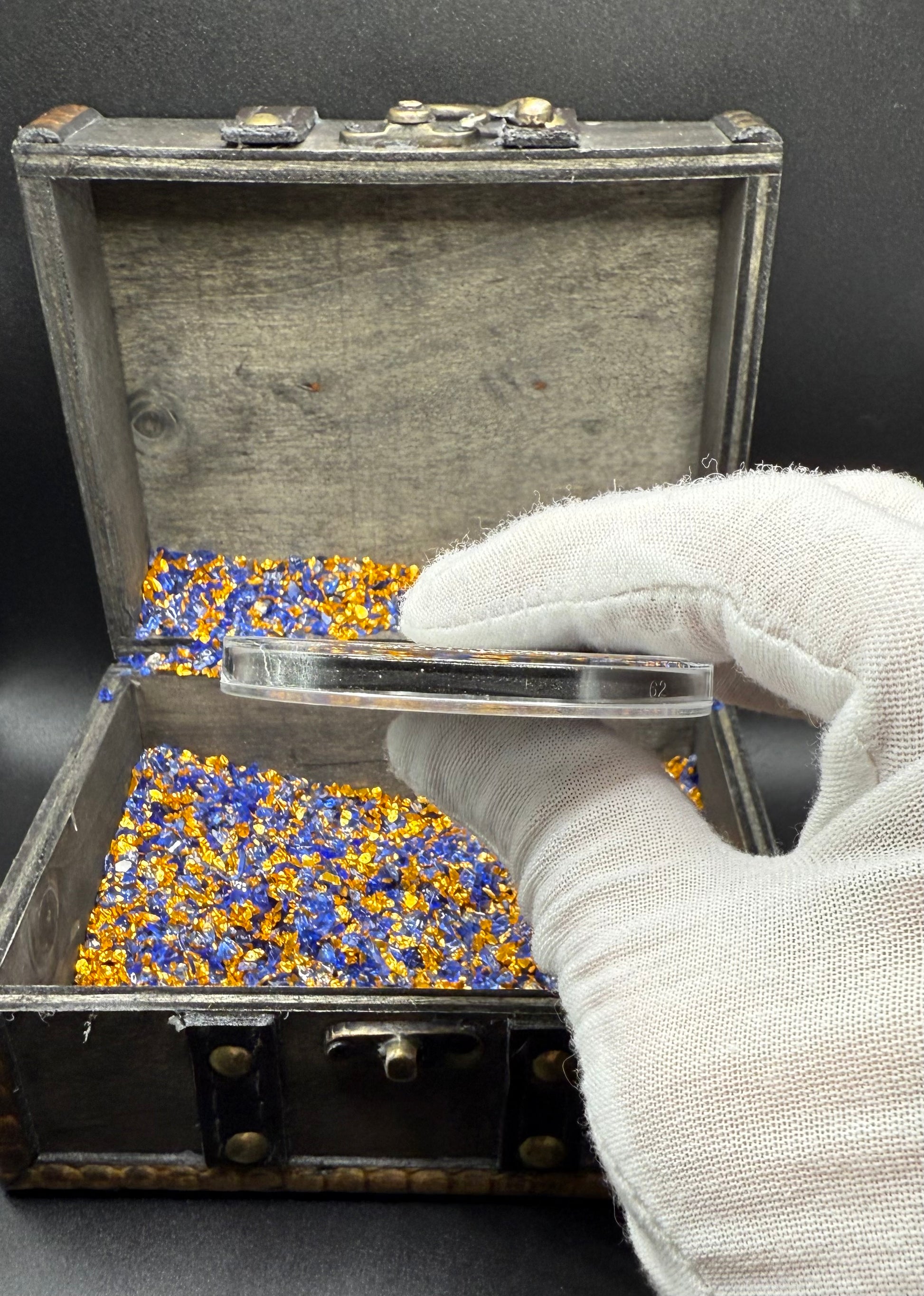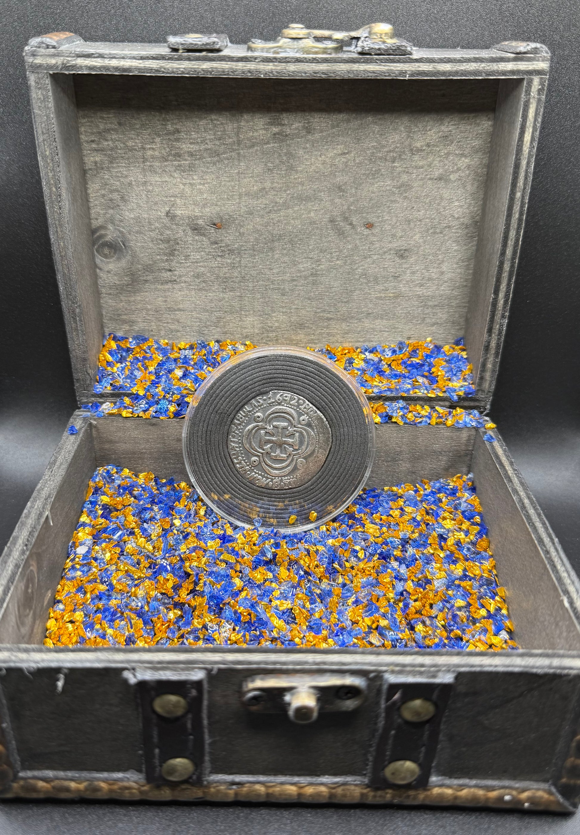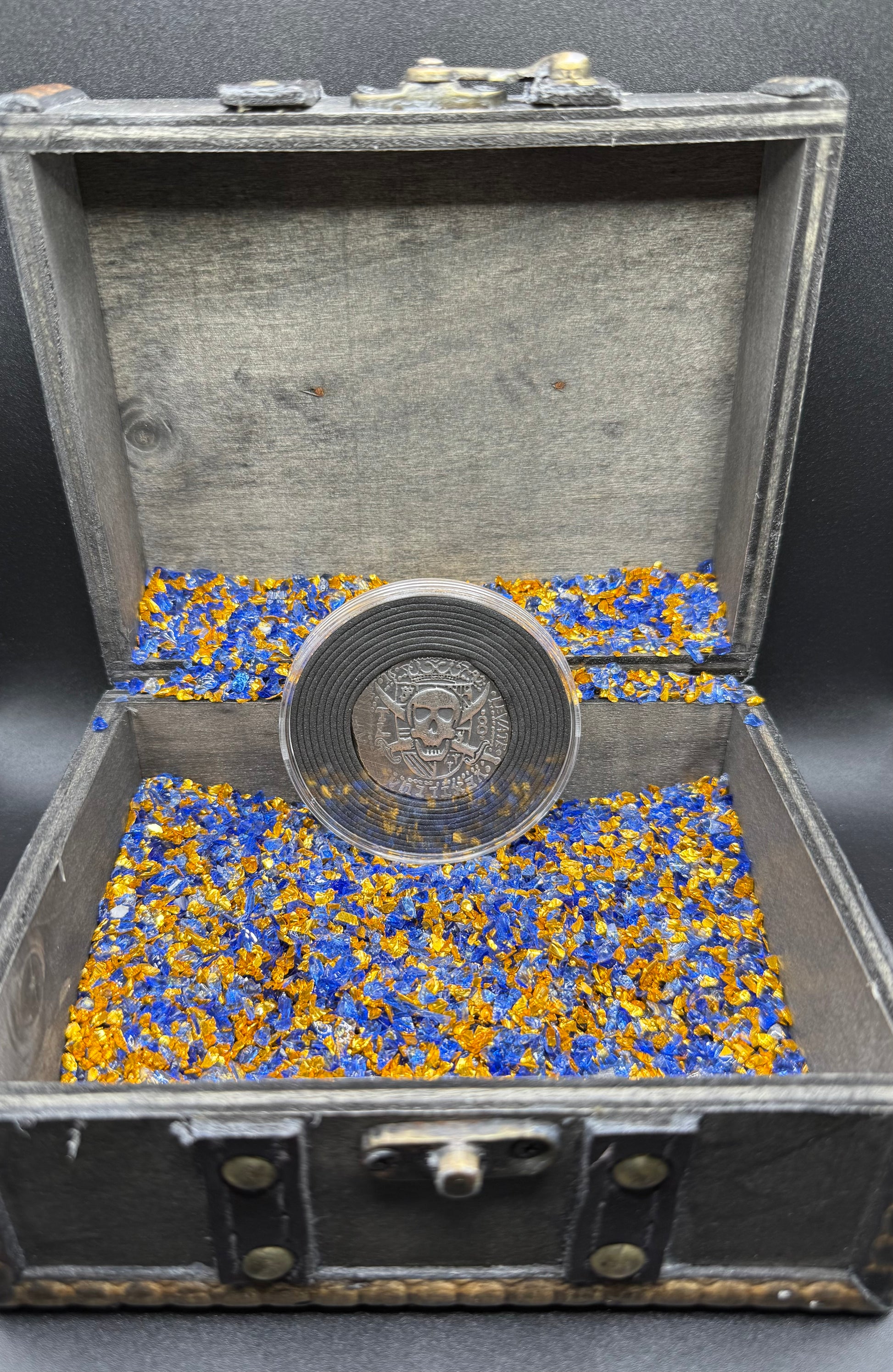 This precious piece comes sealed in a protective capsule (Acid Free / No PVC) protecting it from dust, dirt, and scratches. A custom wooden pirate treasure chest is included to secure your valuable pirate treasure. Certificate of authenticity is included.