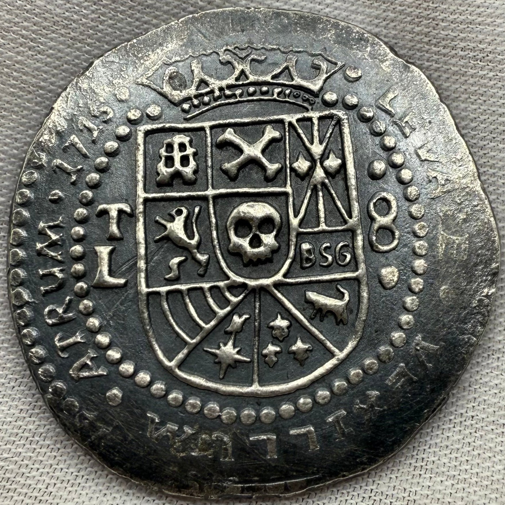This piece was minted in 2025 by Peculiar Coins using 27 grams of .999 fine silver. One side of the treasure has the inscription 'Atrum 1715 Levate Vexillum which means 'raise the flag'. The other side has the inscription 'homine mortui non vicunt' which means ' dead men do not conquer'. The design features a distinctive shield. This silver piece is carefully handcrafted on the anvil using 27 grams of pure silver (.999).