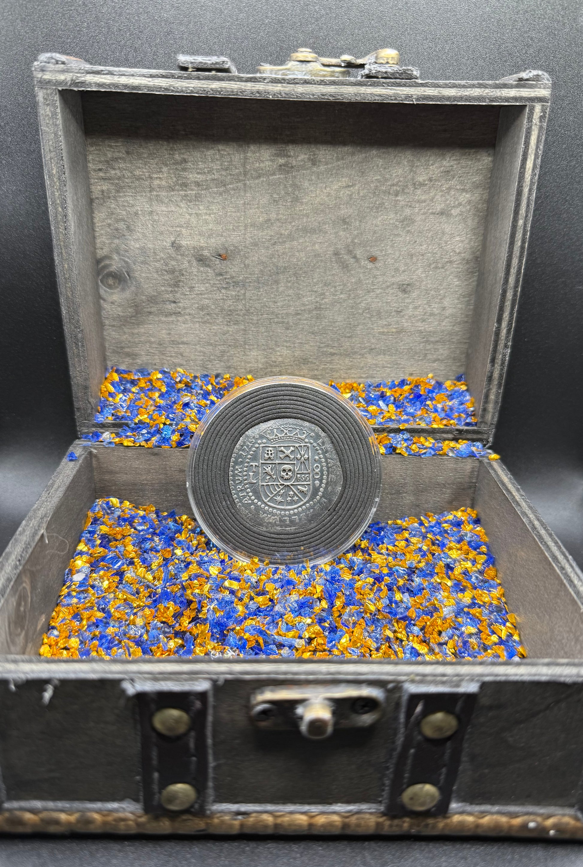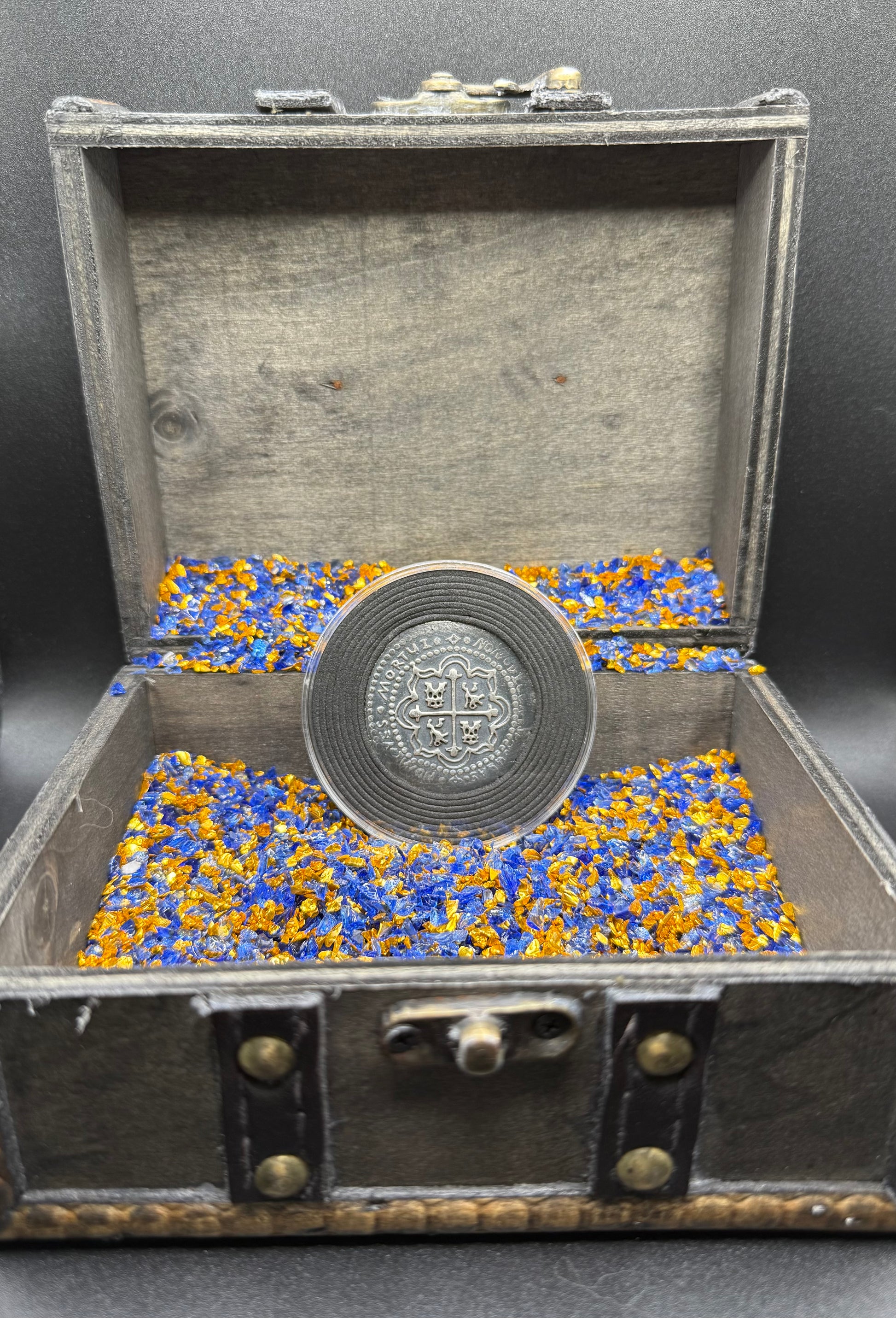 '1715 Spanish Silver' Pirate Treasure Hand Crafted by Peculiar Coins 27 Gram .999 Fine Silver Round Antique Finish Includes Wood Treasure Chest, Capsule & COA Mint Condition